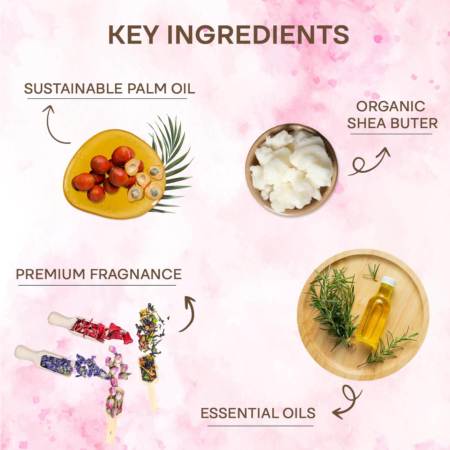 - 📋 Soap Bars Ingredients ➤ Sustainable Palm Oil (for cleansing and moisturizing), Palm Kernel Oil (enhances foam and provides creamy texture), Aqua (water), Certified Organic Shea Butter (deeply nourishes and soothes dry & sensitive skin), Vegetable Glycerin (draws moisture into the skin), Essential Oils and/or Fragrance, Sodium Gluconate (natural sugar-based preservative), Sodium Chloride, Titanium Dioxide (food grade)