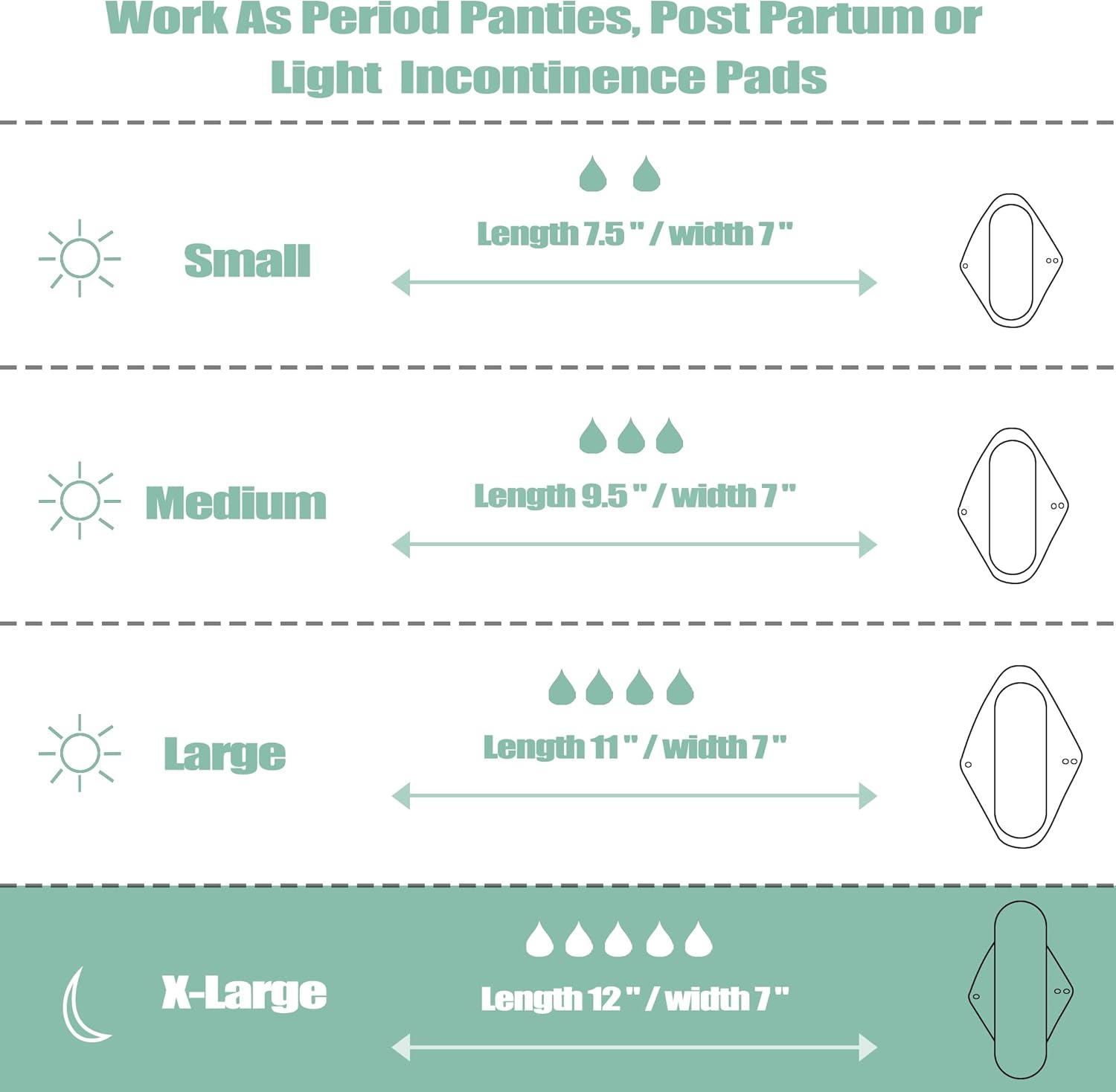 - Four Size Available, small size 8 inch long X width (including wings) 7 inch, Middle size 9.5 inch long X width 7 inch, Large size 11 inch long X 7 inch, Extra Large cloth pads, length 12 inch X width 8 inch; We recommend 6-12 small/medium cloth menstrual pads and 1-3 large heavy flow mama cloth pads