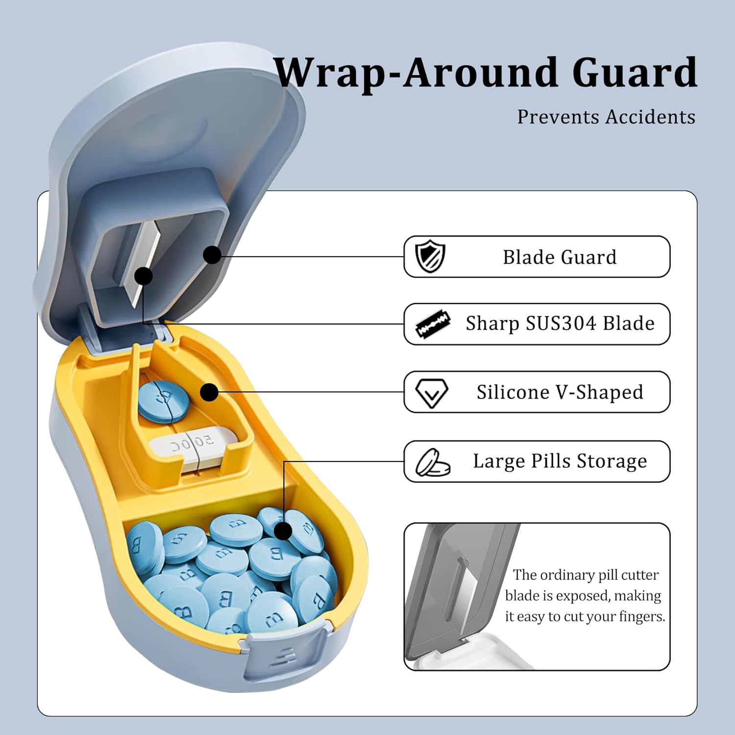 Pill Cutter Splitter for Small and Tiny Pills - Professional Pill Cutter for Small or Large Pills | Wrap-Around Blade Guard | Detachable Nonslip V-Shaped Pad | Easy Open | Back Storage, Cyan (Blue)