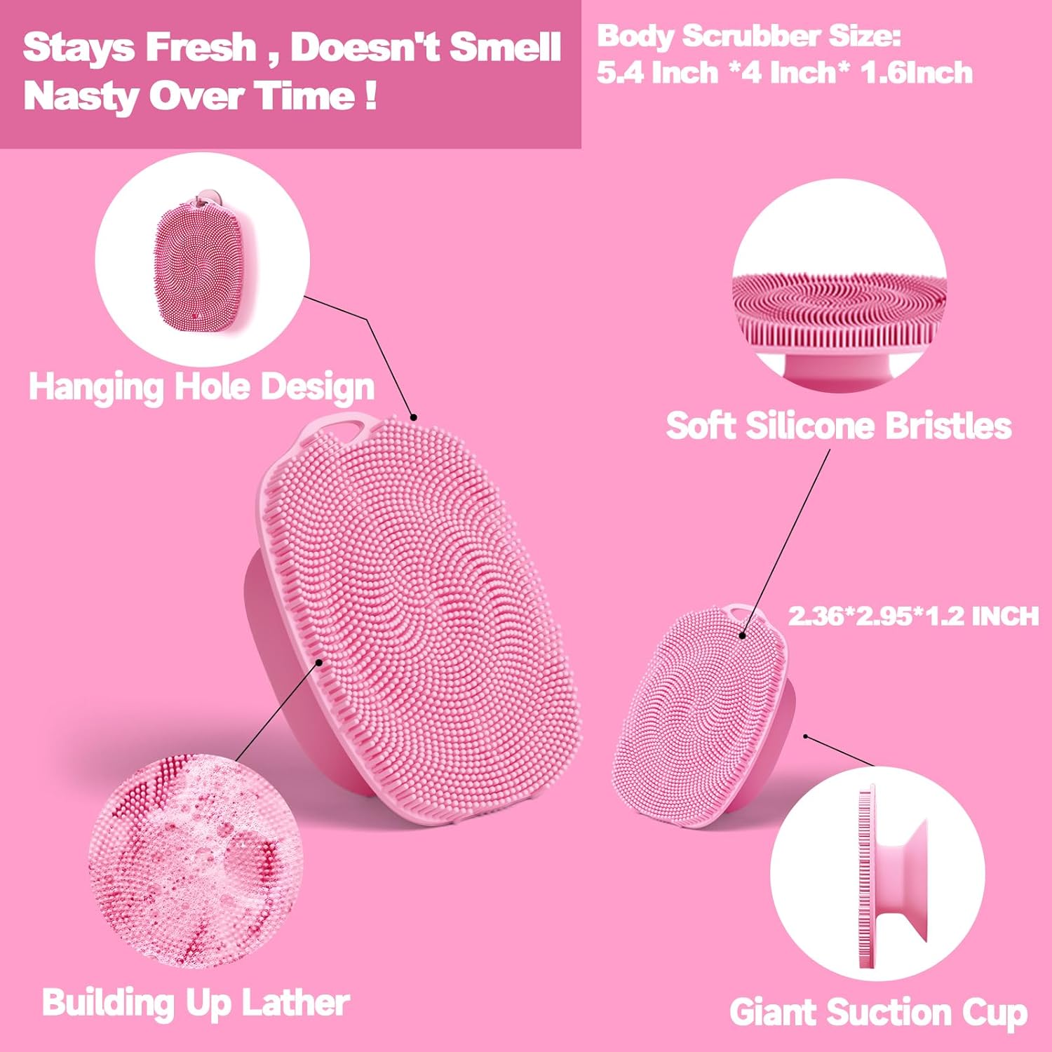 Soft Silicone Body Scrubber, Gentle Like a Hand Exfoliating Your Skin and Build Up Lather, Back Large Suction Cup Easy to Store, & Deep Clean (Body Scrubber + Face Scrubber Pink)