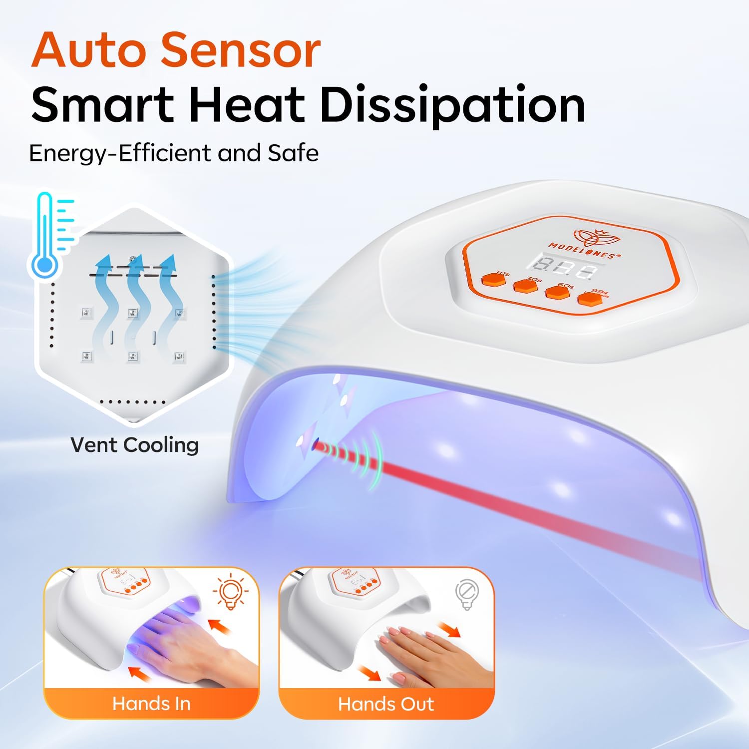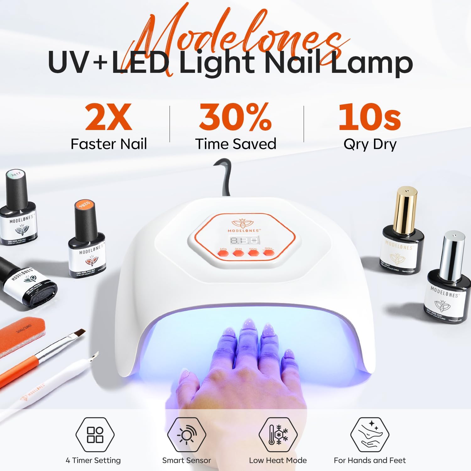 - Versatile Compatibility for All Needs - Modelones uv nail lamp equipped with UV/LED dual-light technology and upgraded high-transparency beads, it dries quickly to cut waiting time. The safe 365nm+ 405nm UV&LED wavelengths work with all gel polishes—base coat, top coat, color gel, acrylic gel, builder gel, nail tips, and press-ons