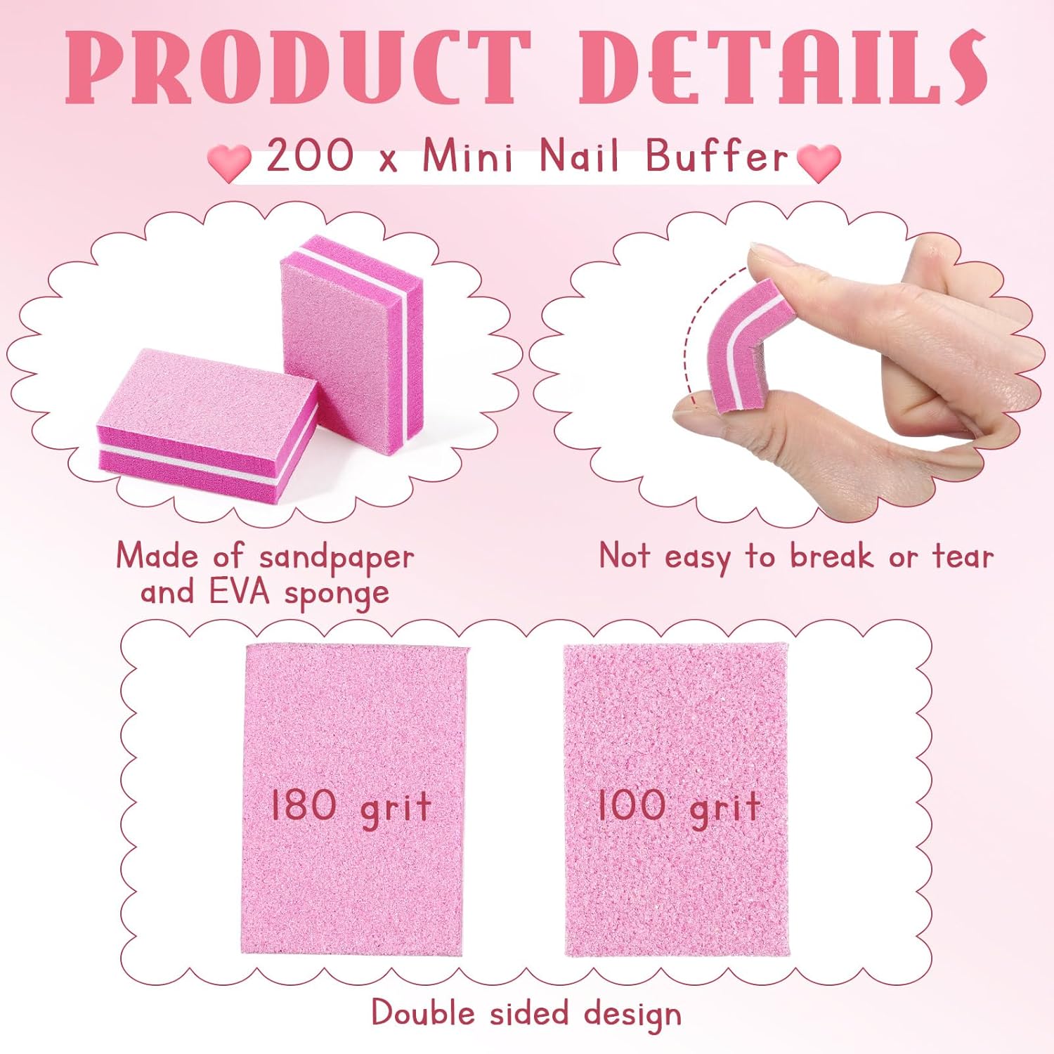 - Double Sided Design: these nail buffers feature two sides, styled in pink color, so you can choose either side according to your preference, as it offers two different grits for polishing; The 100 grit coarse side is designed to file uneven nail surfaces, while the 180 grit fine side helps buff away oils and smooth rough edges, easily refining your nails