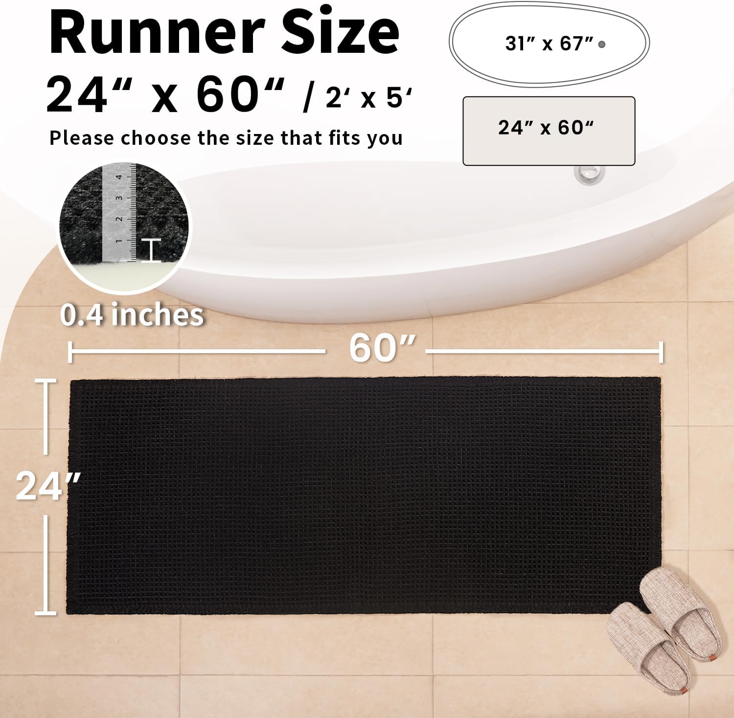 Black Long Bathroom Rug - Waffle Runner Bath Mat Non Slip Washable, Super Absorbent & Quick Dry, Boho Bath Mat Farmhouse Bathroom Decor, 24'' x 60'', Black