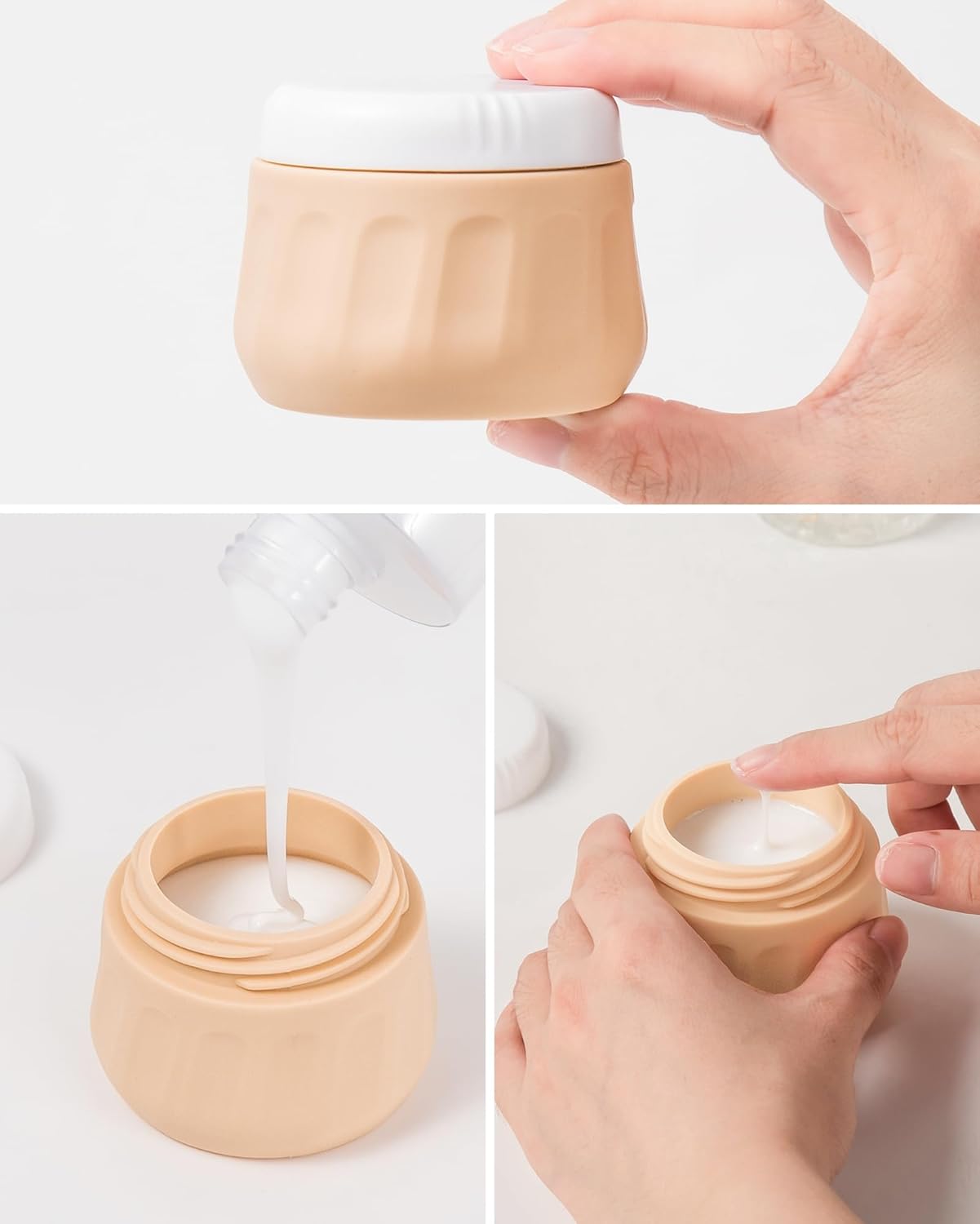 - Travel Size Toiletries: Set includes 4 silicone squeeze bottles 3oz(90ml) and 4 silicone cream jars 3oz(90ml) and clear make-up bag 6.46x2.87x5.31inch. Contents identification label sticker included