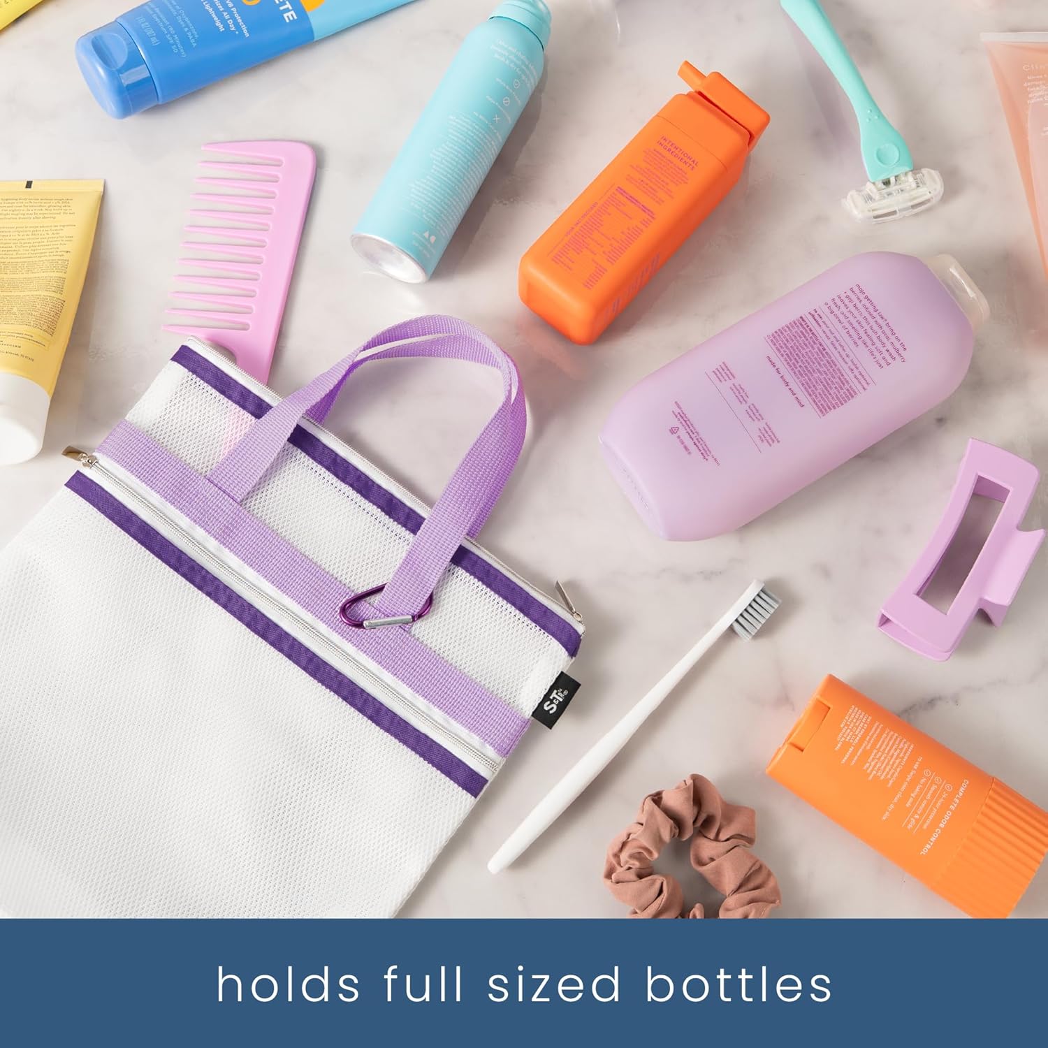 S&T INC. Mesh Shower Caddy, Shower Bag for Dorm Room Essentials, Gym Bag, Camping and More, Two Zippered Pockets, White and Purple, 10 Inches x 10 Inches