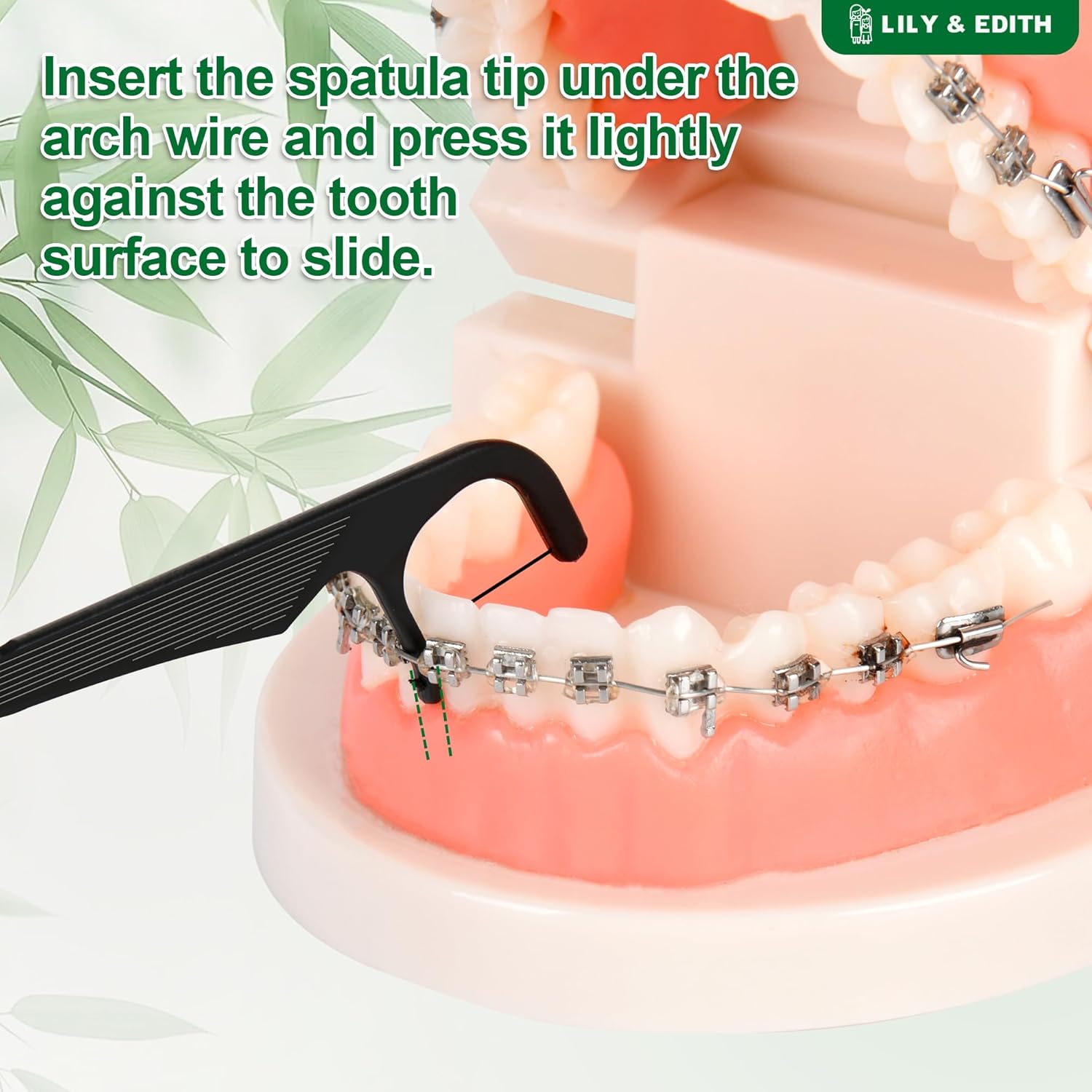 - BAMBOO CHARCOAL HANDLE – Unlike traditional plastic flossers, our braces floss picks handles are made with bamboo charcoal to help reduce plastic waste while offering a sturdy, comfortable grip.