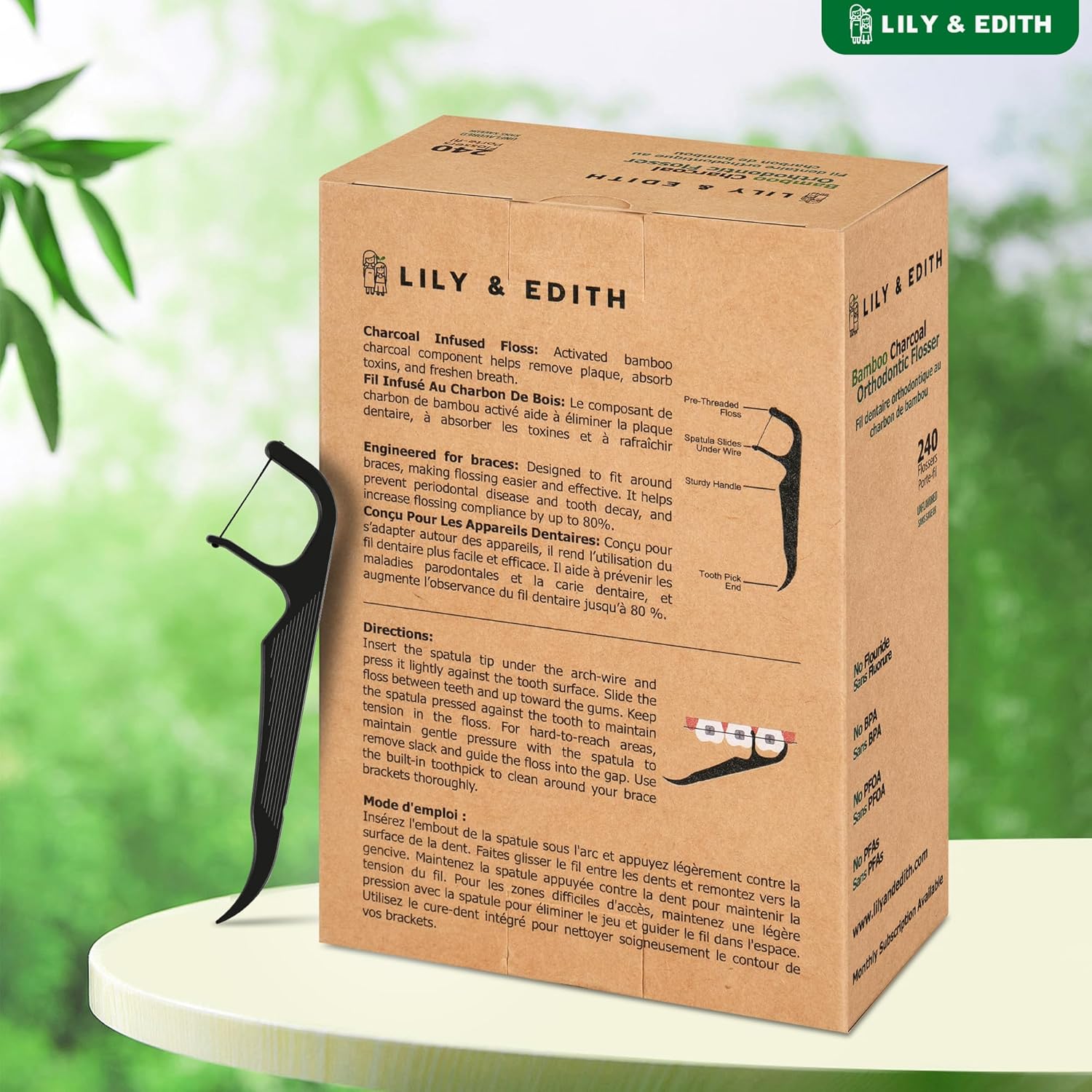 LILY & EDITH Orthodontic Flossers for Braces for Adult & Kid, 240 Count, Ortho Dental Floss Picks, Fluoride & Chemical Free, Fits Under Arch Wire, Bamboo Charcoal Flosser Remove Plaque, Unflavored