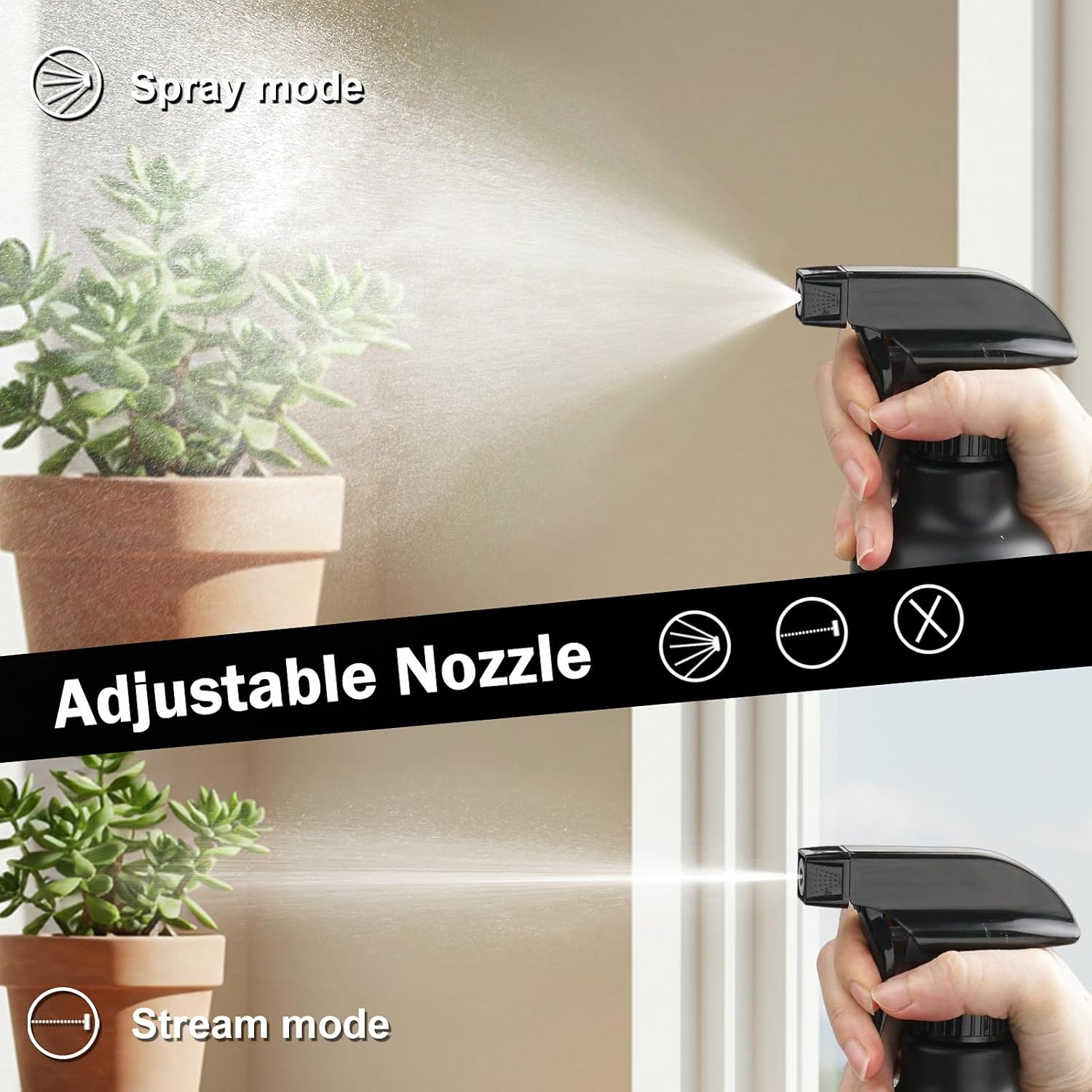 - ADJUSTABLE NOZZLE SPRAY BOTTLE: Rotate the nozzle to choose between a fine mist (gentle enough for delicate plants or hairstyling) and a targeted stream (ideal for deep cleaning or outdoor surfaces). The extended straw ensures efficient liquid use. An extra nozzle for you to replace.