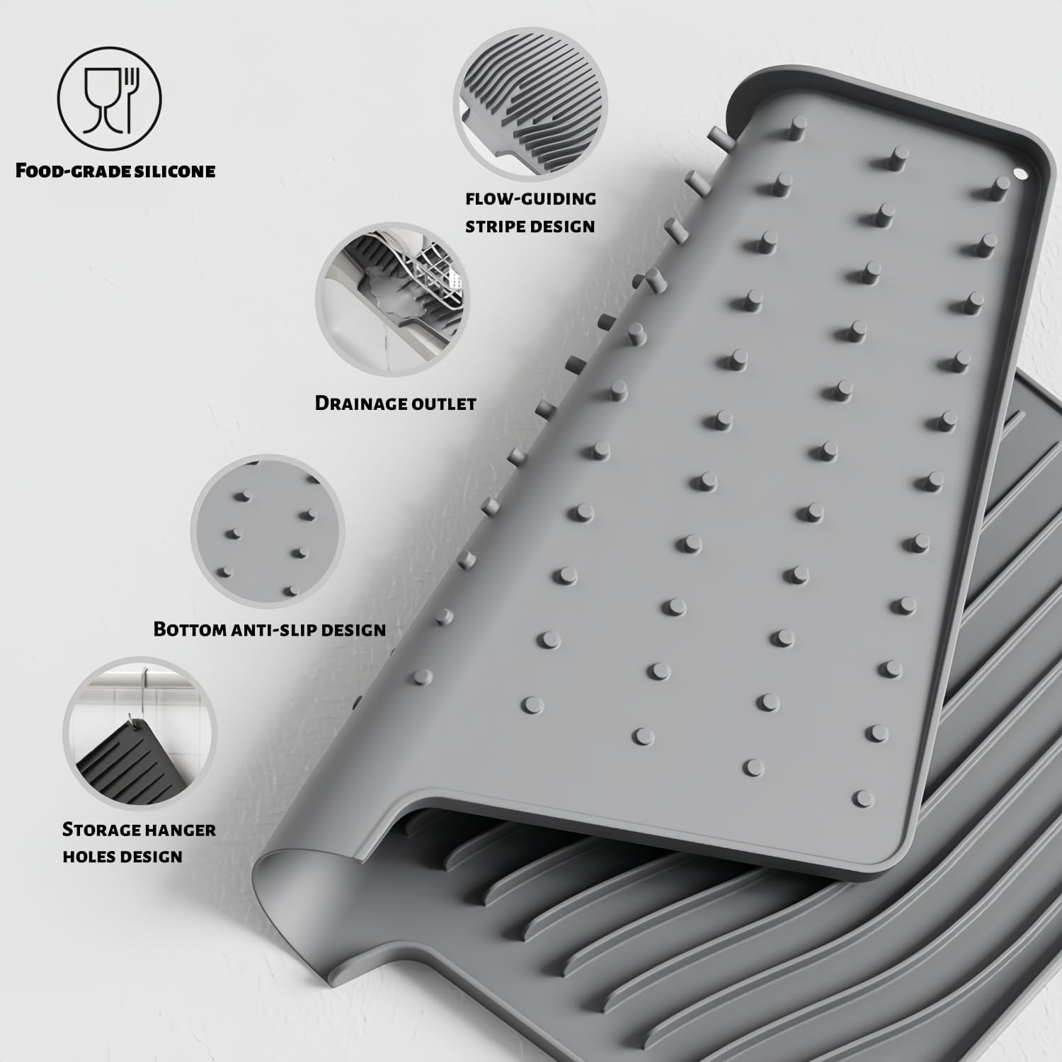 CIEO Silicone Dish Drying Mat for Kitchen Counter, Slope Fast Self-Draining, Non-Slip Drain Pad, Easy Clean Countertop Protection Mat, Multiple Use for Dishes Drying Rack(18.9"x 13.58",Gray)