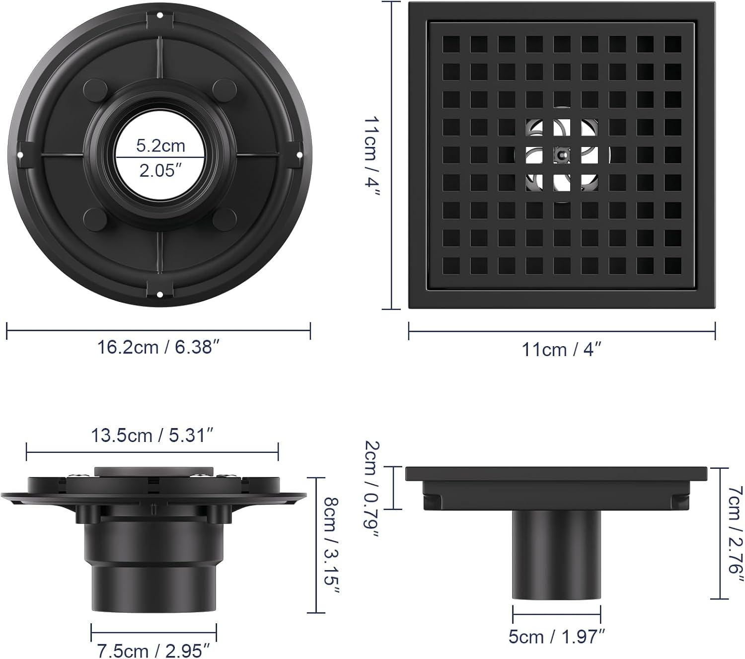- 【Standard Universal Type】 This 4 × 4 inch square black shower drain cover features a standard 2-inch central drain outlet—compatible with standard US NO-HUB Drain Base Systems. Its precision-engineered grating effectively traps debris and hair, ensuring unobstructed drainage.