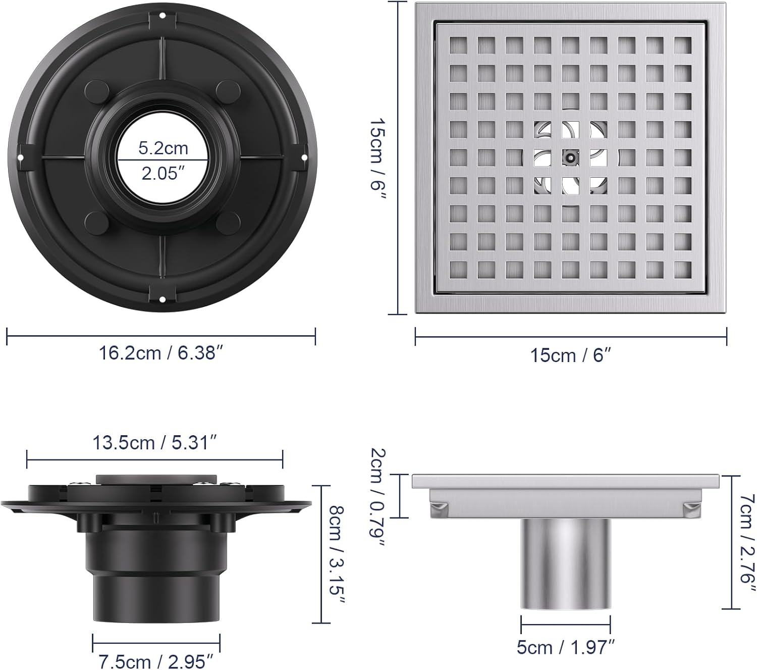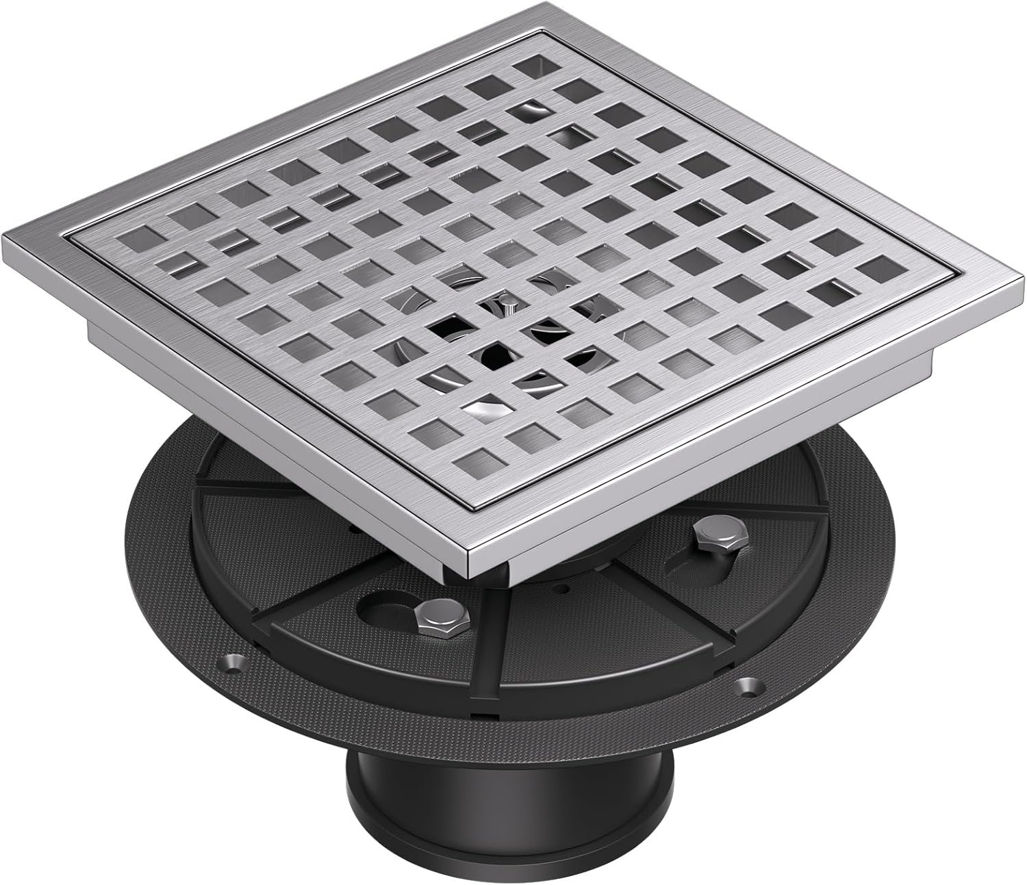 - 【Standard Universal Type】 This 6 × 6 inch square brushed nickel shower drain cover features a standard 2-inch central drain outlet—compatible with standard US NO-HUB Drain Base Systems. Its precision-engineered grating effectively traps debris and hair, ensuring unobstructed drainage.