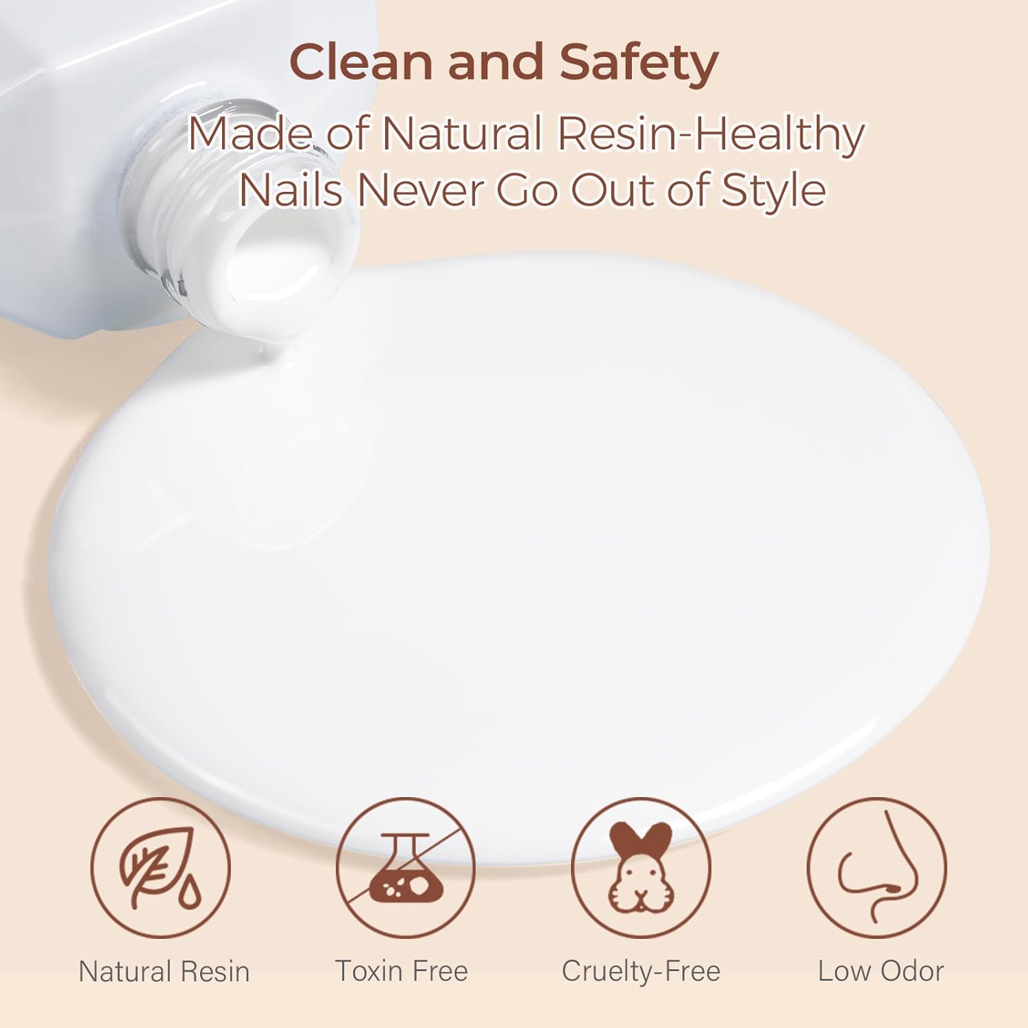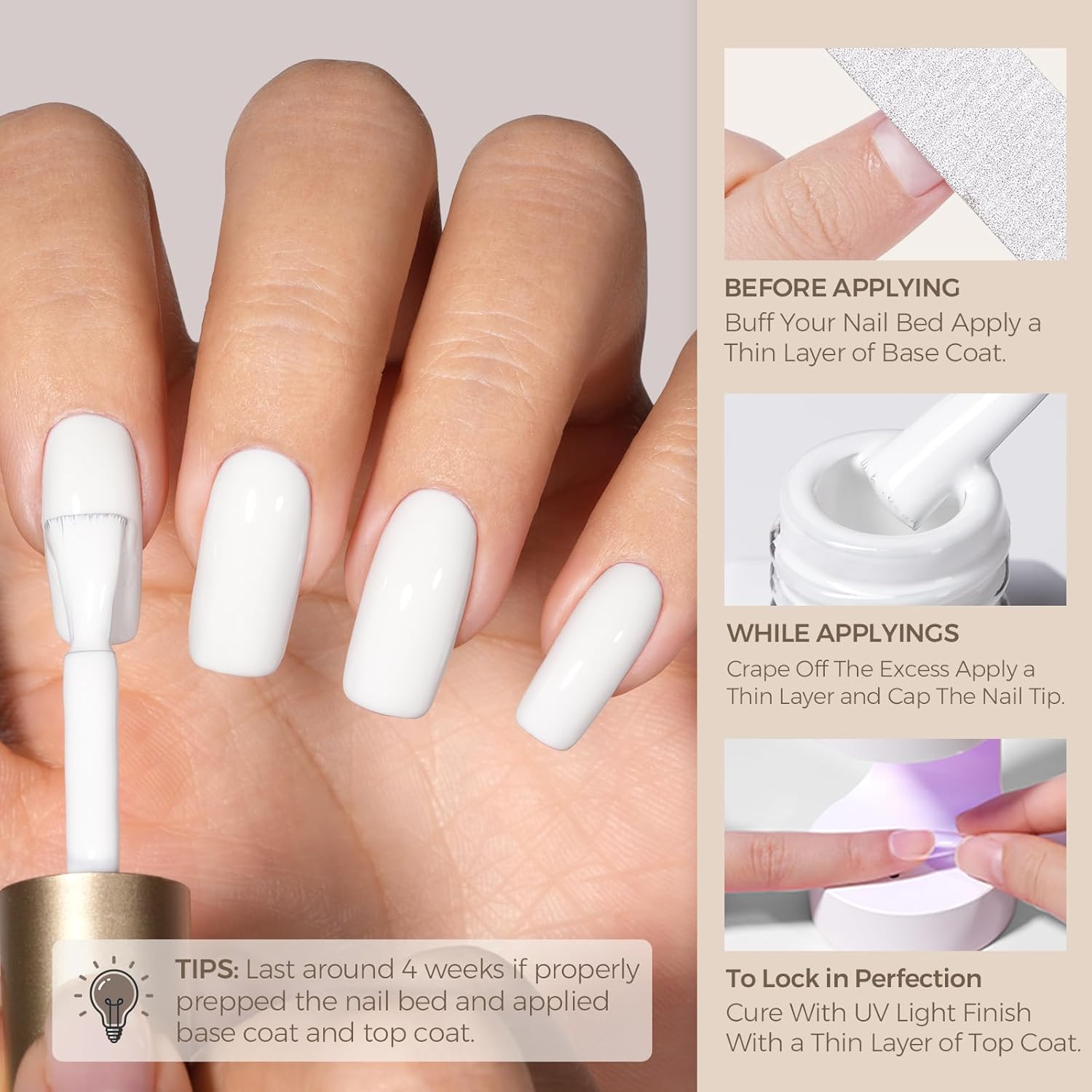 - 【French White Nail Polish】The white color of this gel nail polish has a high glossy and a soft neutral color, which will give a natural look. Whether you're at home, in the office, or at an important party, it blends in perfectly and gives you a relaxed and confident vibe