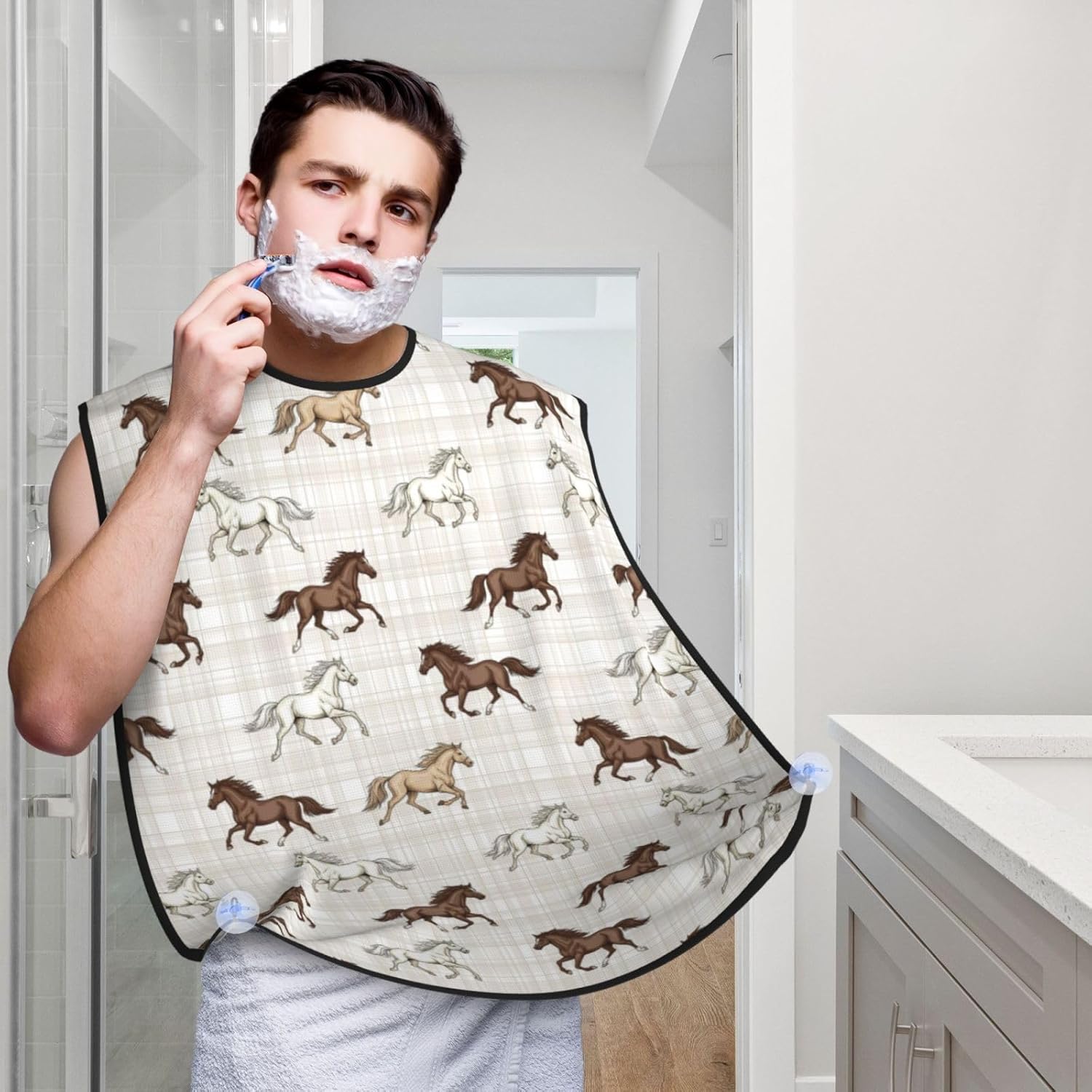 - Ideal Size & Secure Fit for Comfort: Generously sized at 42.1 in x 28.7 in with an adjustable neck (20.5-22.4 in) bib comfortably fits all body types. Includes 3 strong suction cups for stable mirror attachment and a PVC storage bag (including 1 carabiner) for compact organization