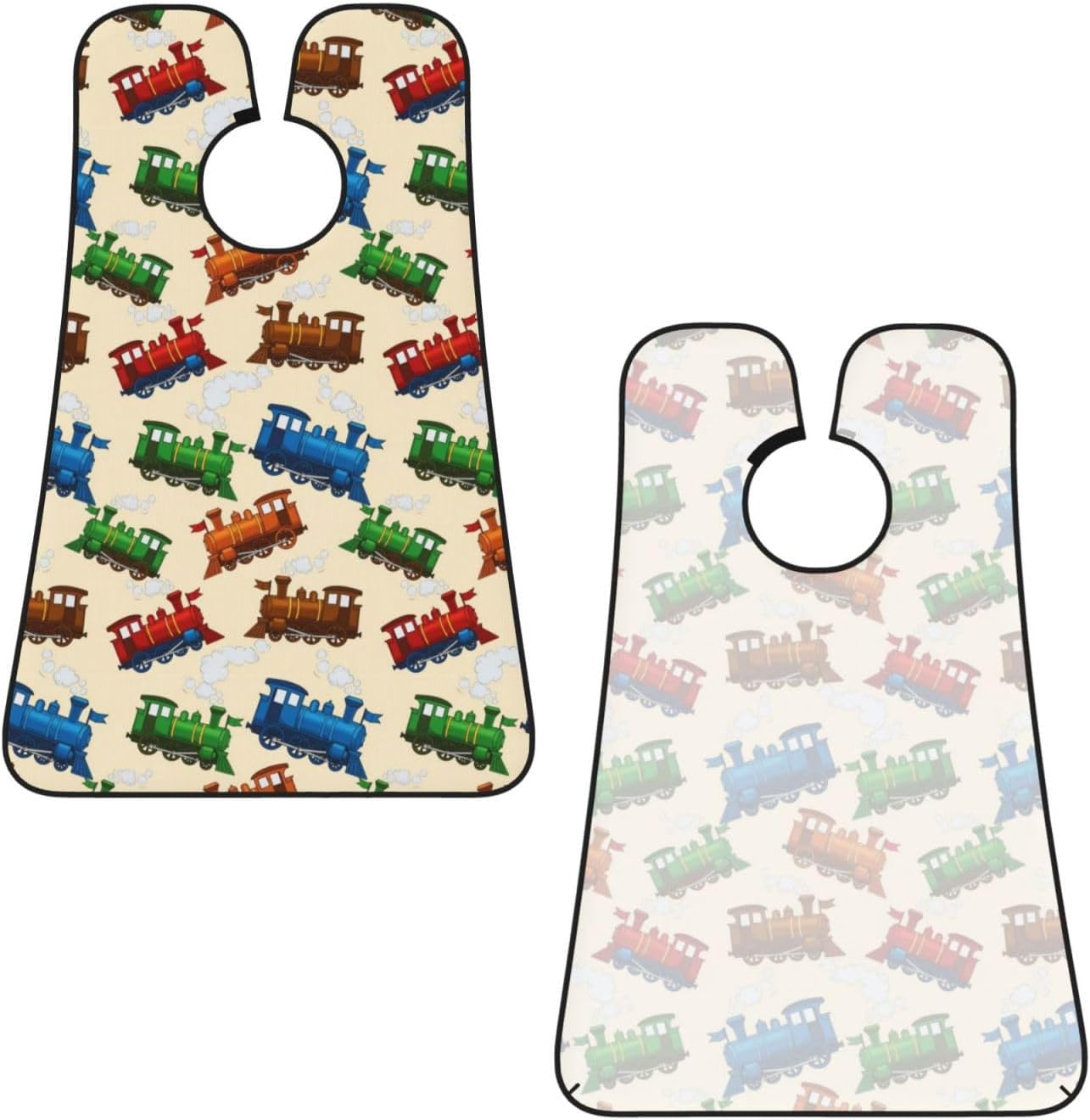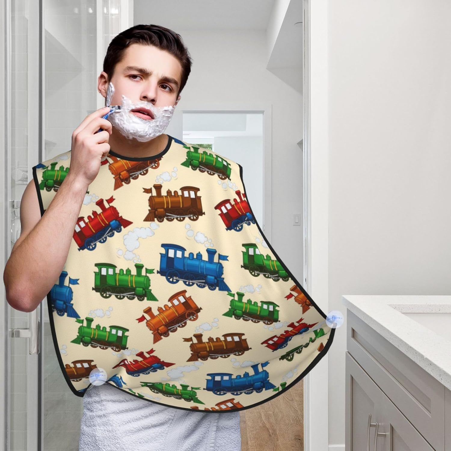 Beard Bib Apron for Men Shaving, Waterproof Non-Stick Hair Catcher with Suction Cups, Grooming Essential for Dad Husband, Cartoon Style Retro Steam Trains Shave Bib