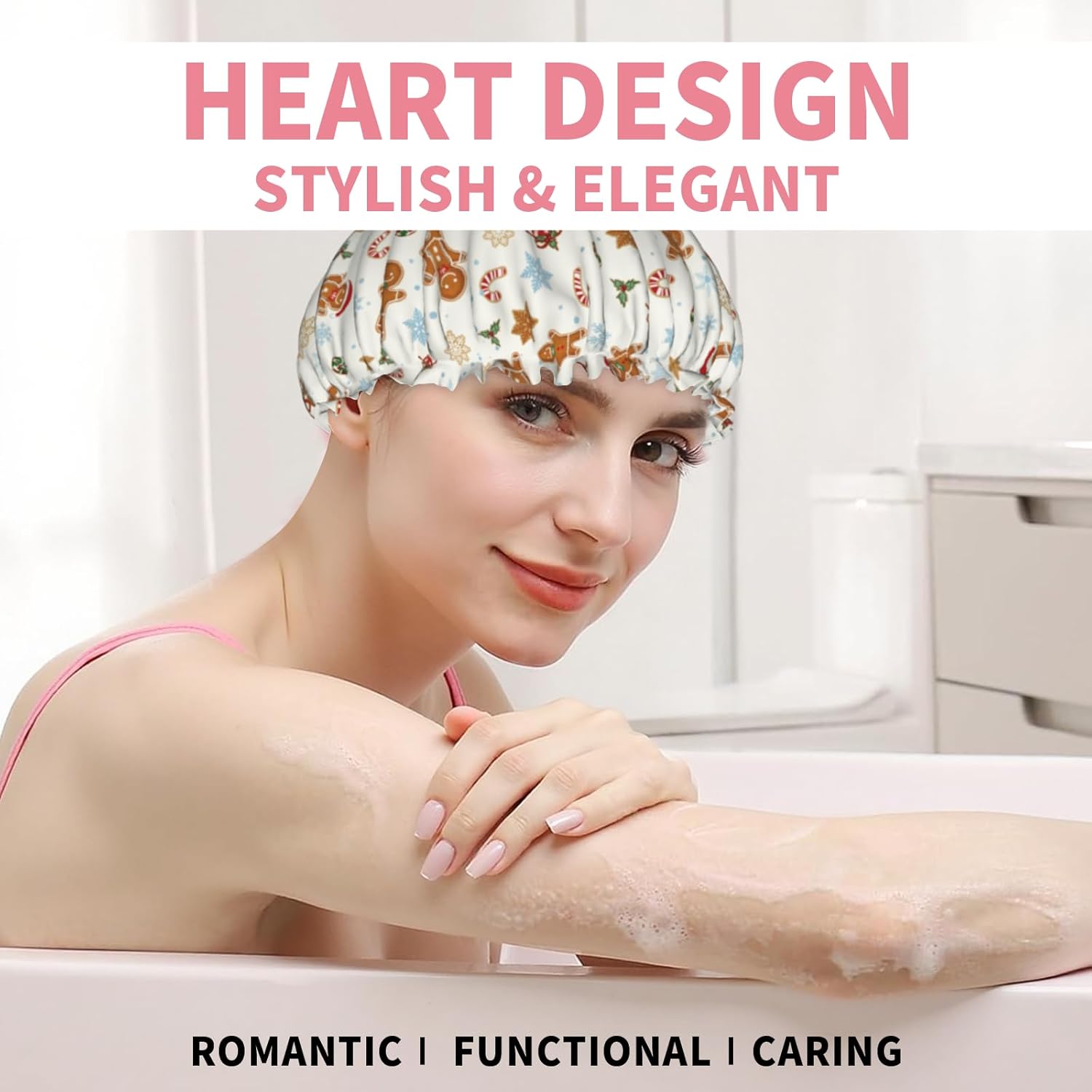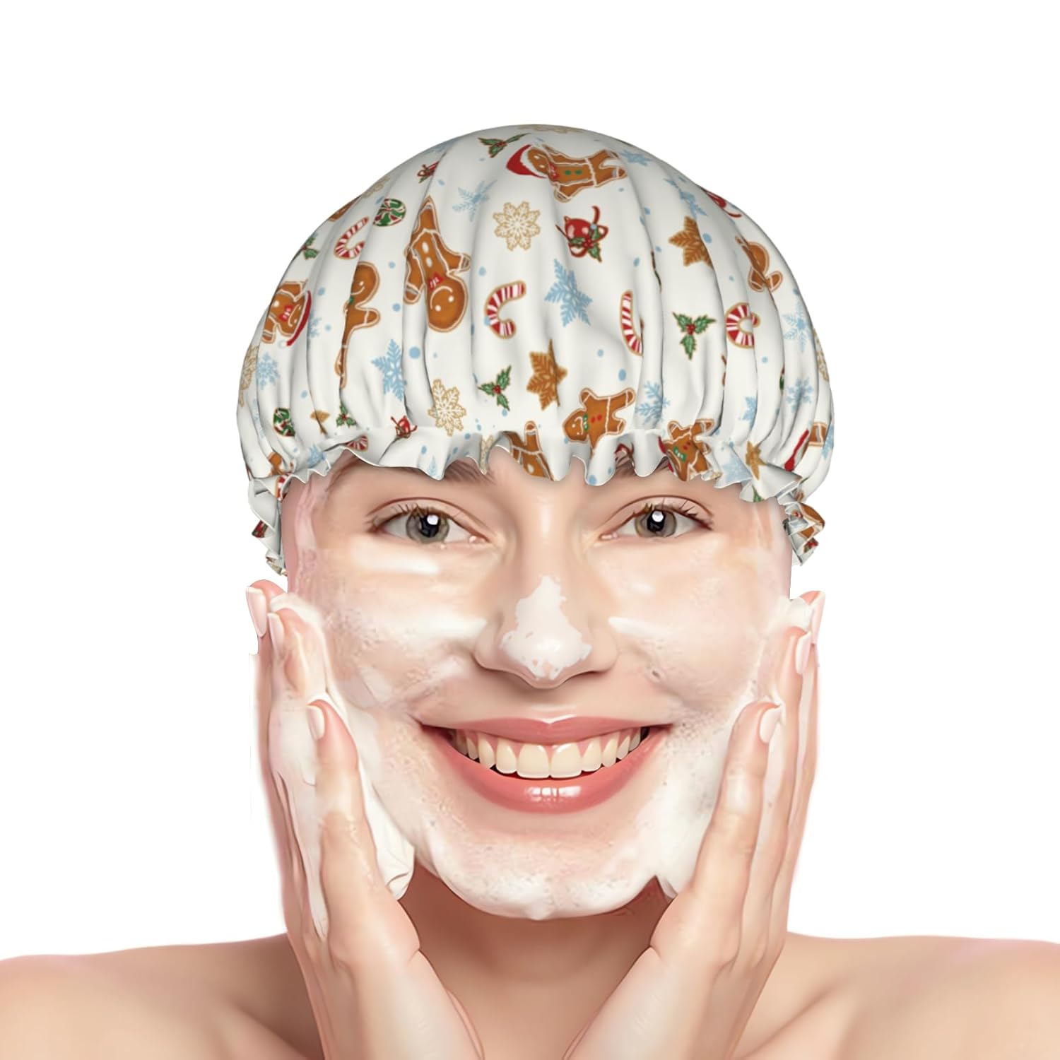 Christmas Shower Caps Gingerbread Man Decorative Hair Caps Xmas Dual-Layer Waterproof Bath Hat Elastic Reusable Hair Hat for Shower Cooking Clean Makeup Travel