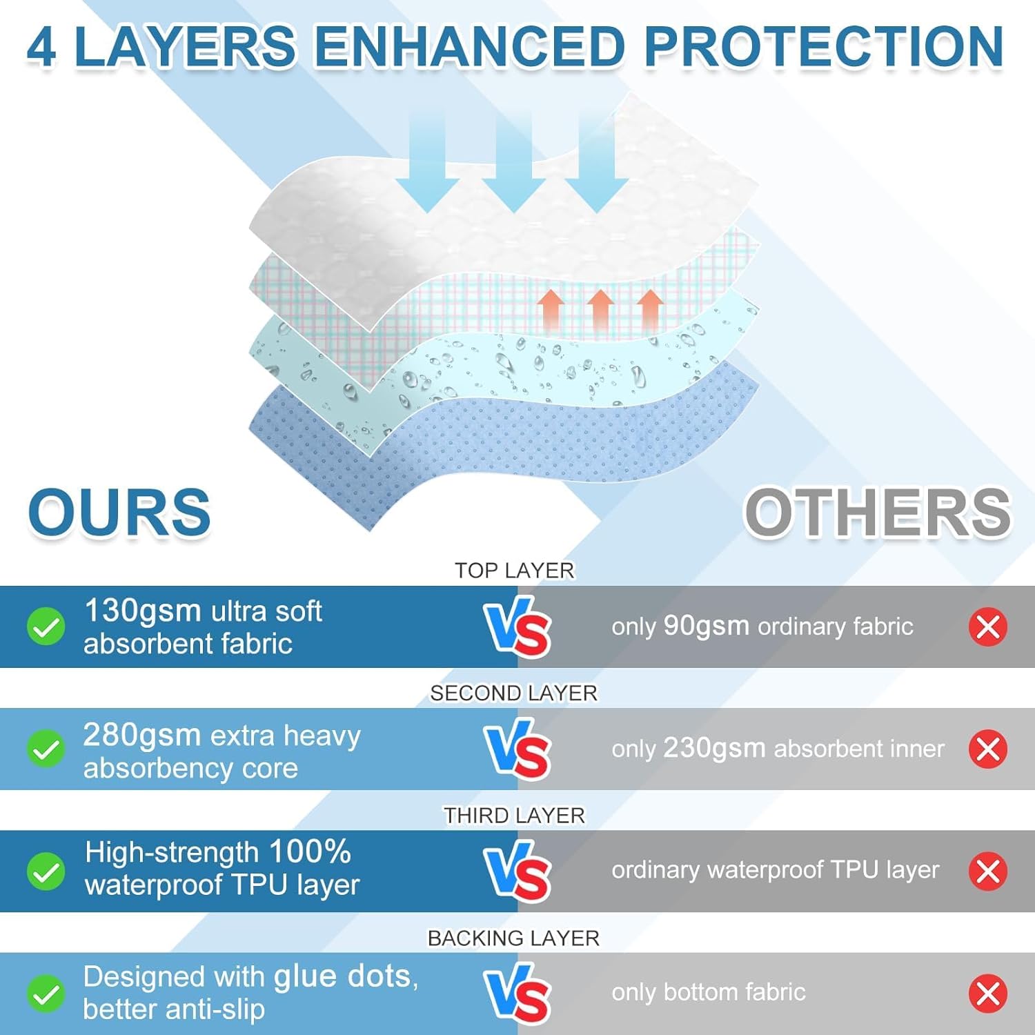- Ultimate Waterproof & Absorbent Protection for Incontinence & Bedwetting: Experience complete peace of mind with our washable mattress protector. The advanced 4-layer design features a soft, skin-friendly surface, a super-absorbent core that locks away moisture, a breathable waterproof barrier, and a non-slip bottom. This reusable bed pad ensures your mattress stays perfectly dry against adult incontinence and potty training accidents, offering comfortable, all-night protection