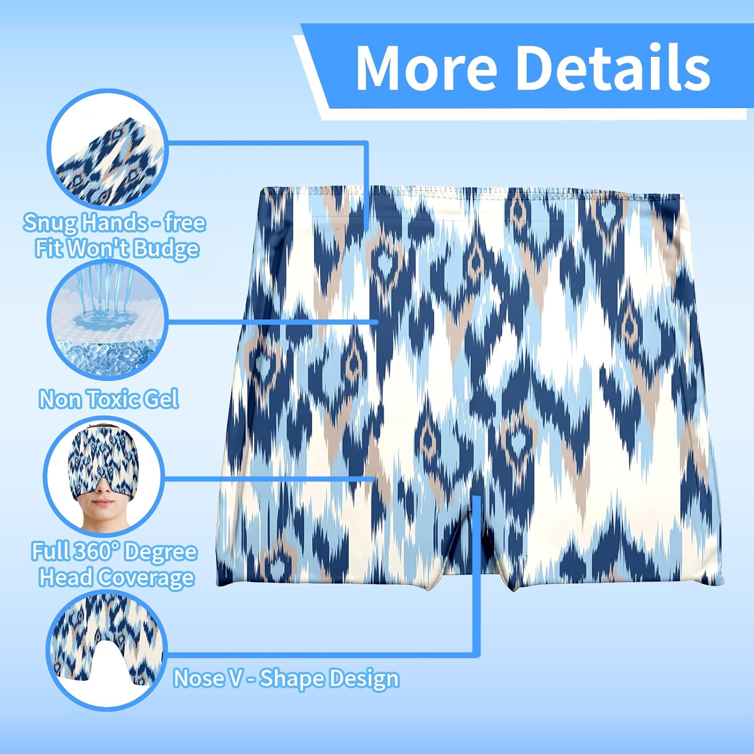 Migraine Relief Cap,Headache Relieve Cap,Bohemian Blue Texture Reusable Gel Ice Head Wrap Cap for Tension,Stress,Hangover & Puffy Eyes.