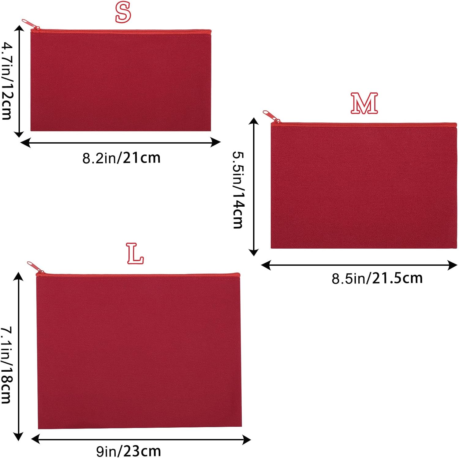 12 Pieces Cotton Canvas Makeup Bag, Multipurpose Cosmetic Bag with Zipper Travel Toiletry Pouch, Blank DIY Craft Bag (Red, L)