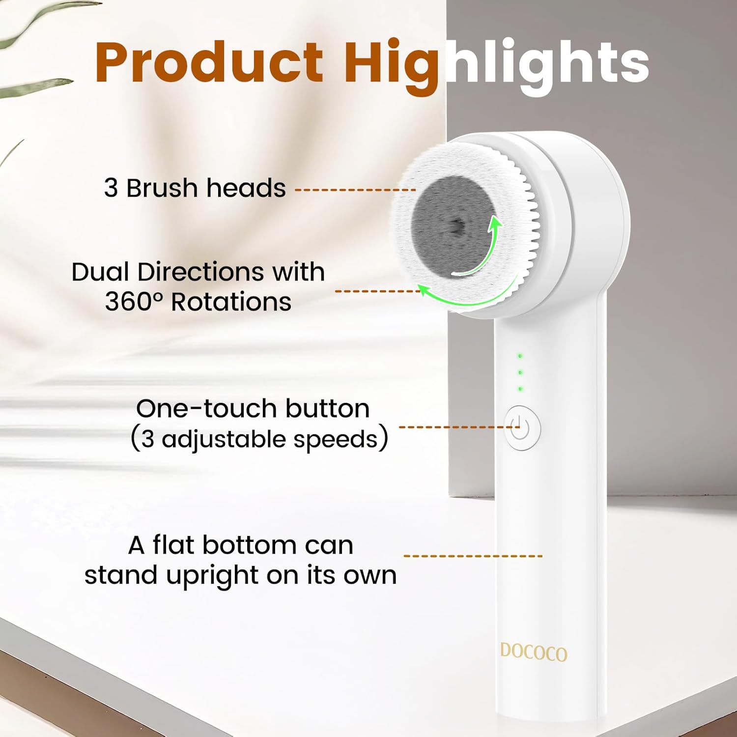 - Dual Rotation Directions: The upgraded DOCOCO 1020A face scrubber features a dual-rotation design, cleansing better than single-direction facial brushes. The soft bristles ensure a gentler and more protective skincare experience