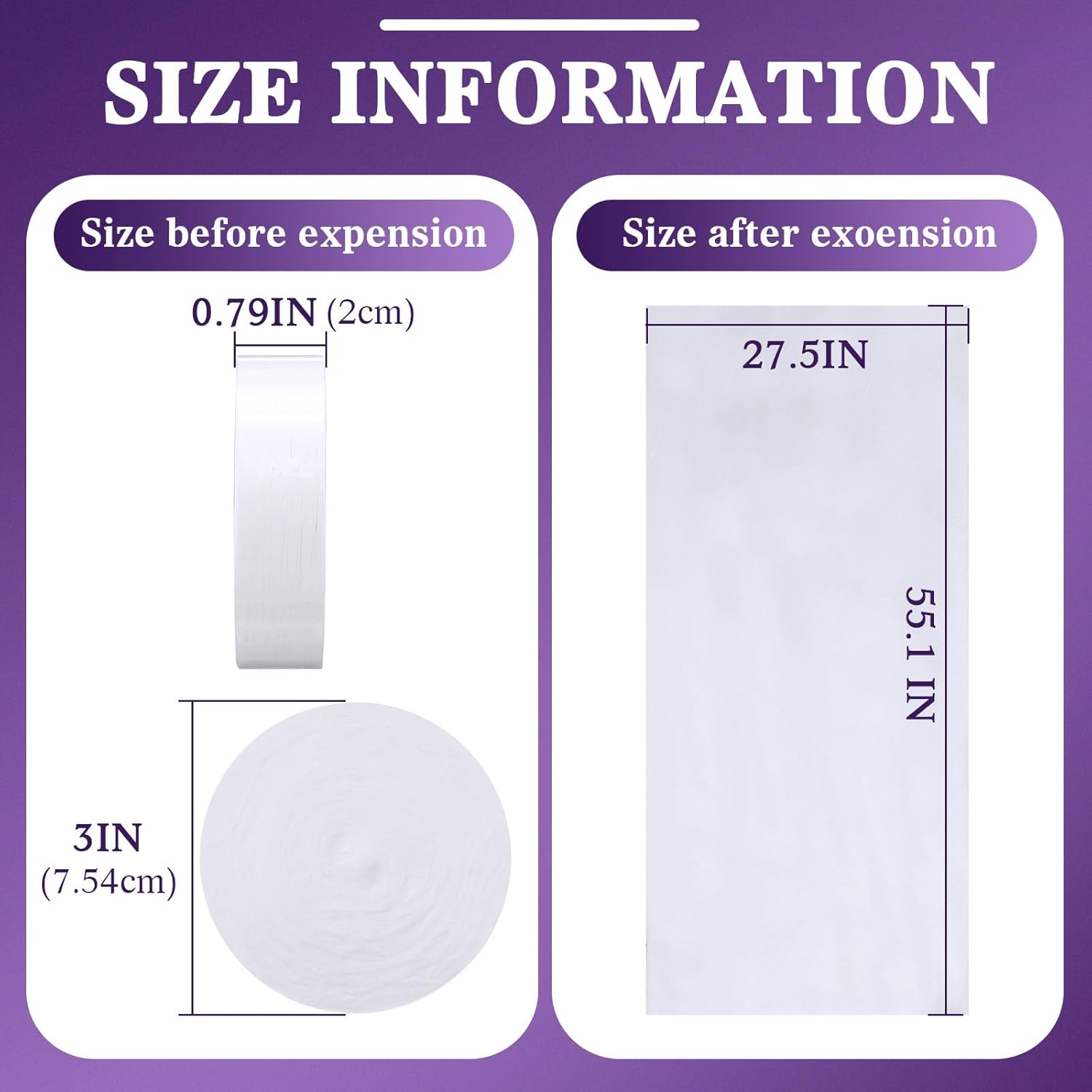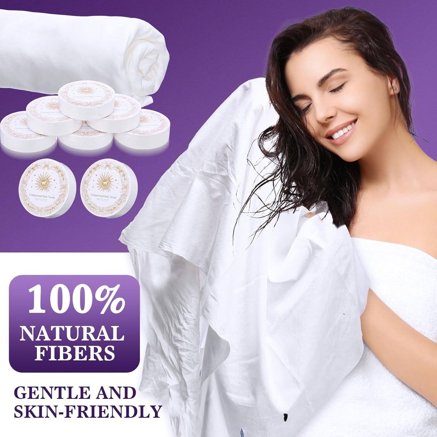 - 50 Pack Compressed Towel Tablets: this bulk set includes 50 large disposable bath towels (55.1" x 27.5"), nice for travel, gym, swimming, or emergency use; Made from soft plant fiber, they expand instantly in water, providing a full-size, hygienic towel whenever needed