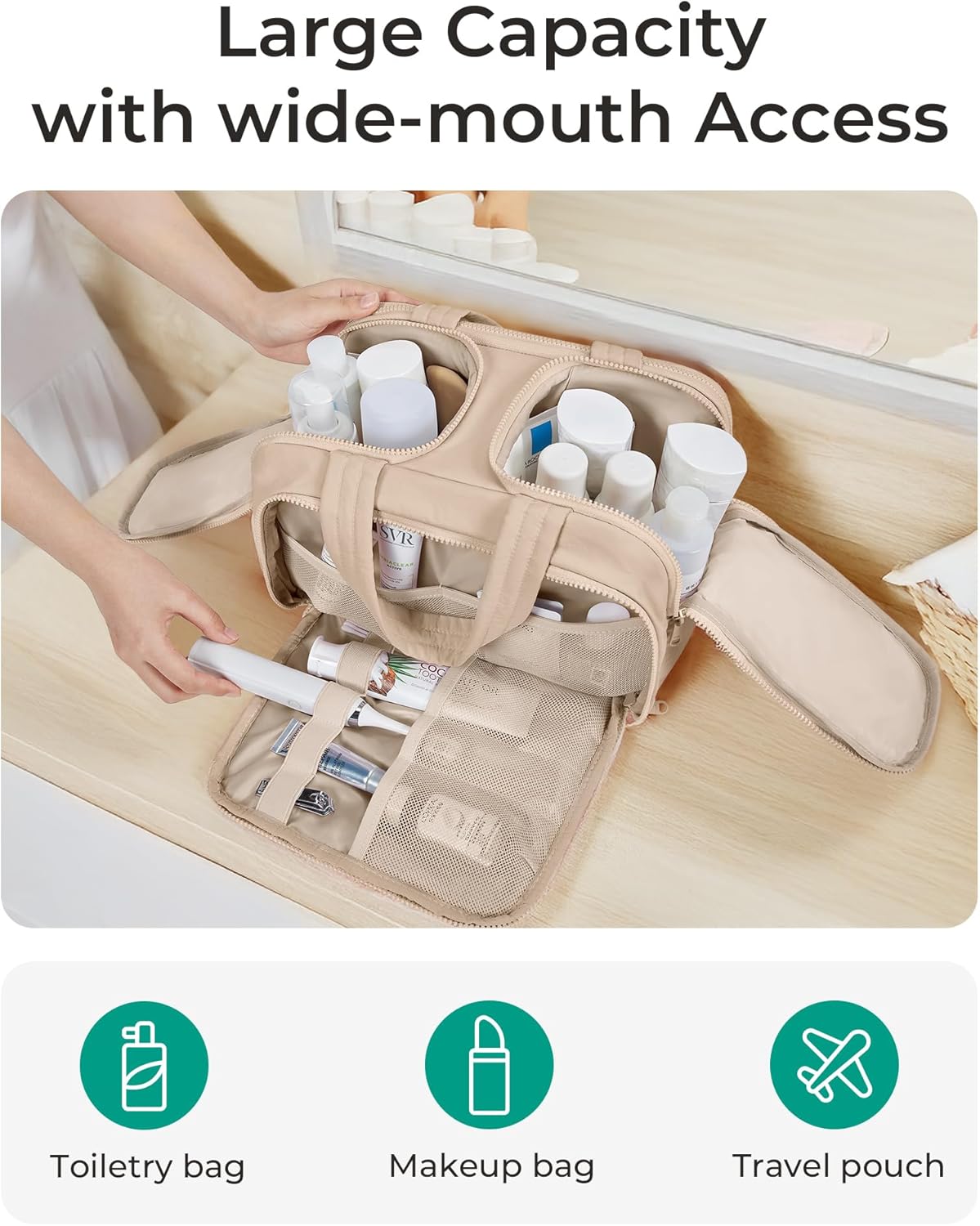 BAGSMART Travel Toiletry Bag, Puffy Toiletry Bag for Women, Wide-open toiletry bags for traveling, Large Travel Cosmetic Makeup Bag Organizer for Accessories,Toiletrie (Khaki)