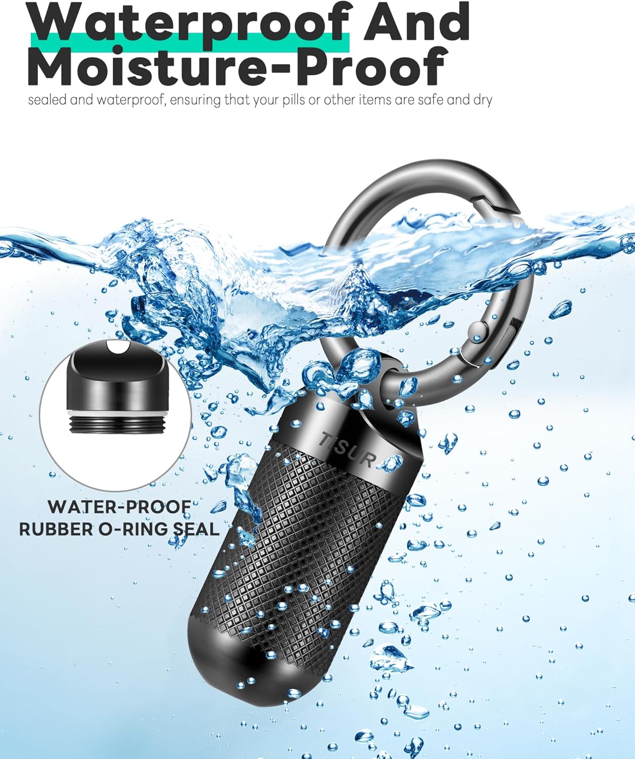 - Waterproof Pill Container: The small metal pill case has a rubber O-ring seal made it airtight and watertight enough to keeps your pills inside safe and dry when you are on vacation, trip, travel, camping or any outdoor activity.