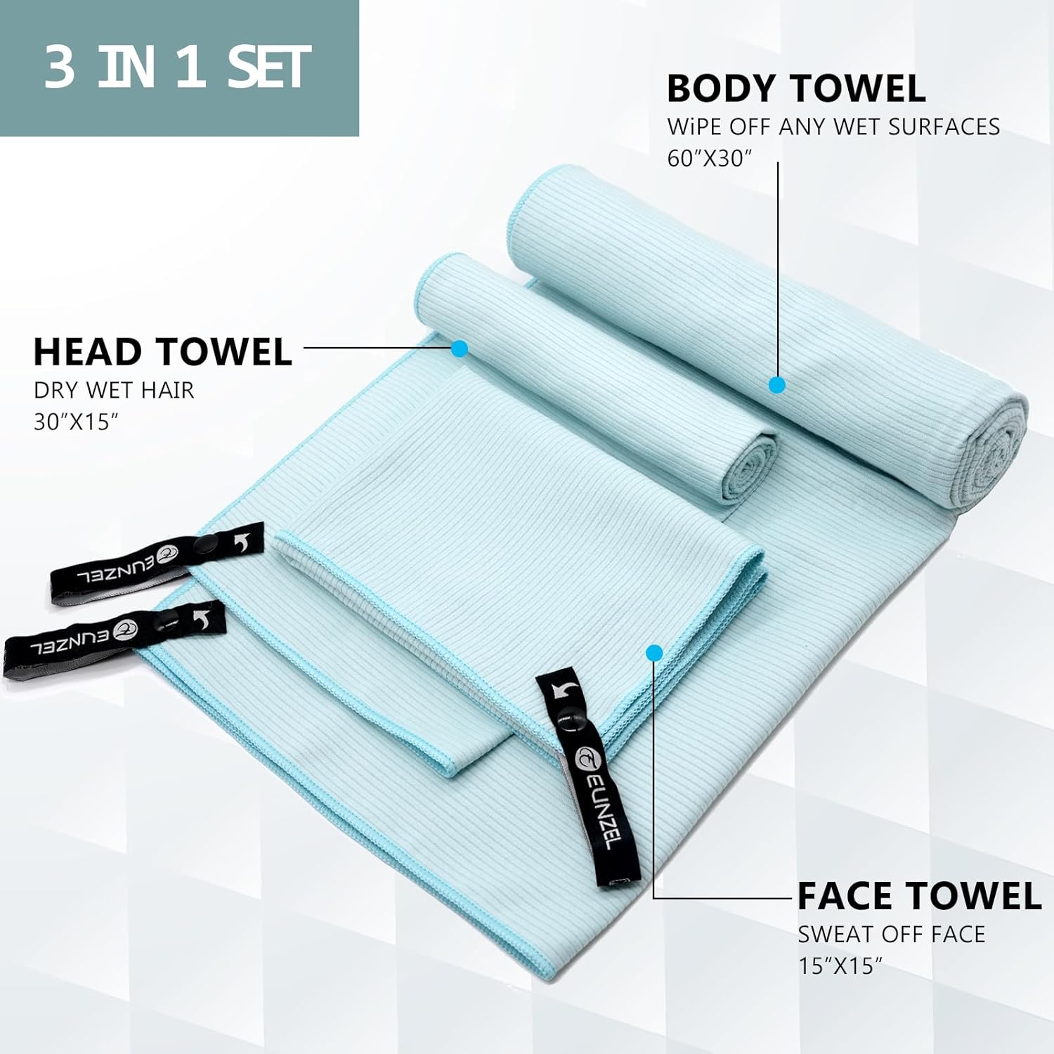 - 3 TOWELS AT 1 PACK: The package includes 3 towels of varying sizes. The small towel (S: 15''x15'') is suitable as a hand towel, perfect for gym and yoga classes due to its lightweight, soft, and quick sweat absorption. The medium towel (M: 30''x15'') is perfect for camping and designed for travel. The largest towel (L: 60''x30'') in the package is ideal for showering, as well as for use at the beach and pool. It is both large and portable