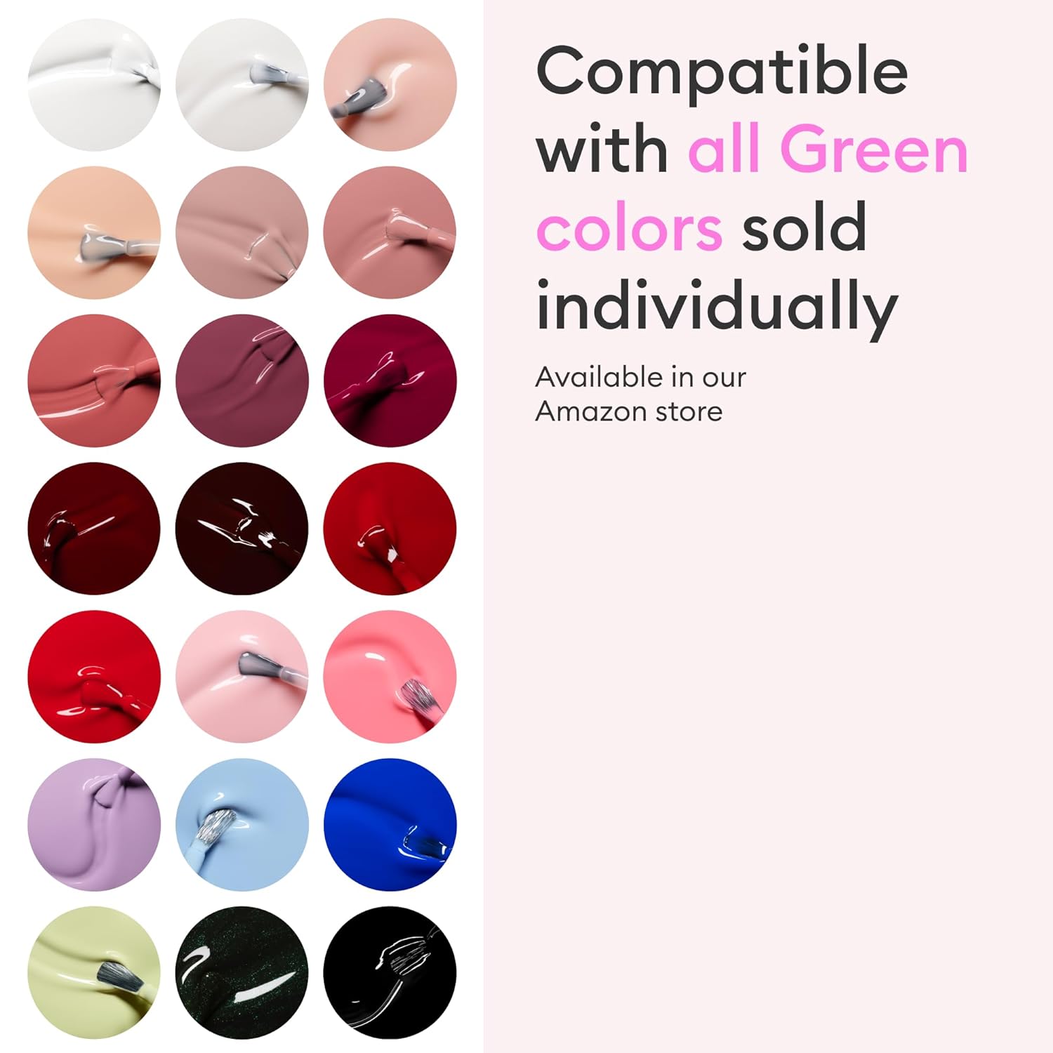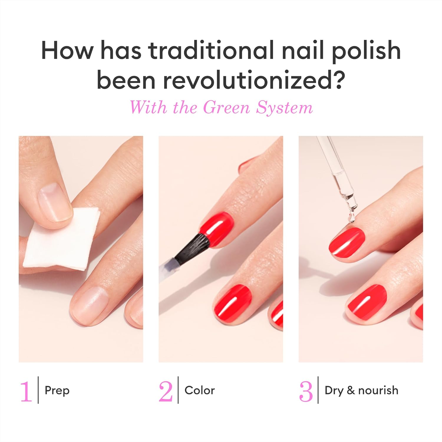 - The set includes: Green Degreaser to prep nails, Green Base Coat with Hexanal for protection, quick dry nail polish Green color Prune (Bordeaux, dark wine), Top Coat Sunshine for shine & durability, plus Quick-Drying Drops with ceramides to halve drying time and nourish nail contours.