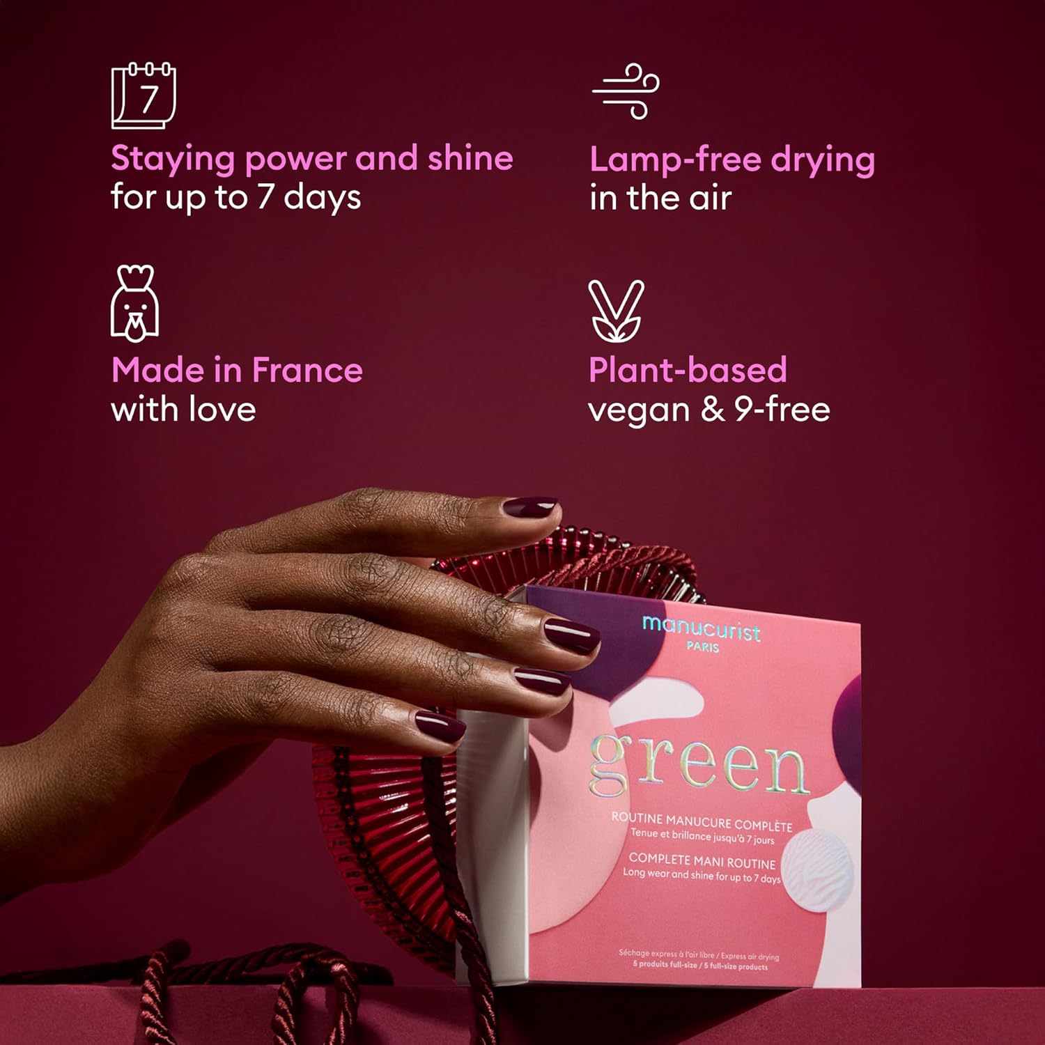Manucurist Green™ System Holiday Gift Set with Plum - Professional Vegan Plant-Based Manicure Kit: 1 Degreaser, 1 Base Coat, 1 Nail Polish Dark Wine, 1 Top Coat, Dried Drops- Christmas Gifts for Women