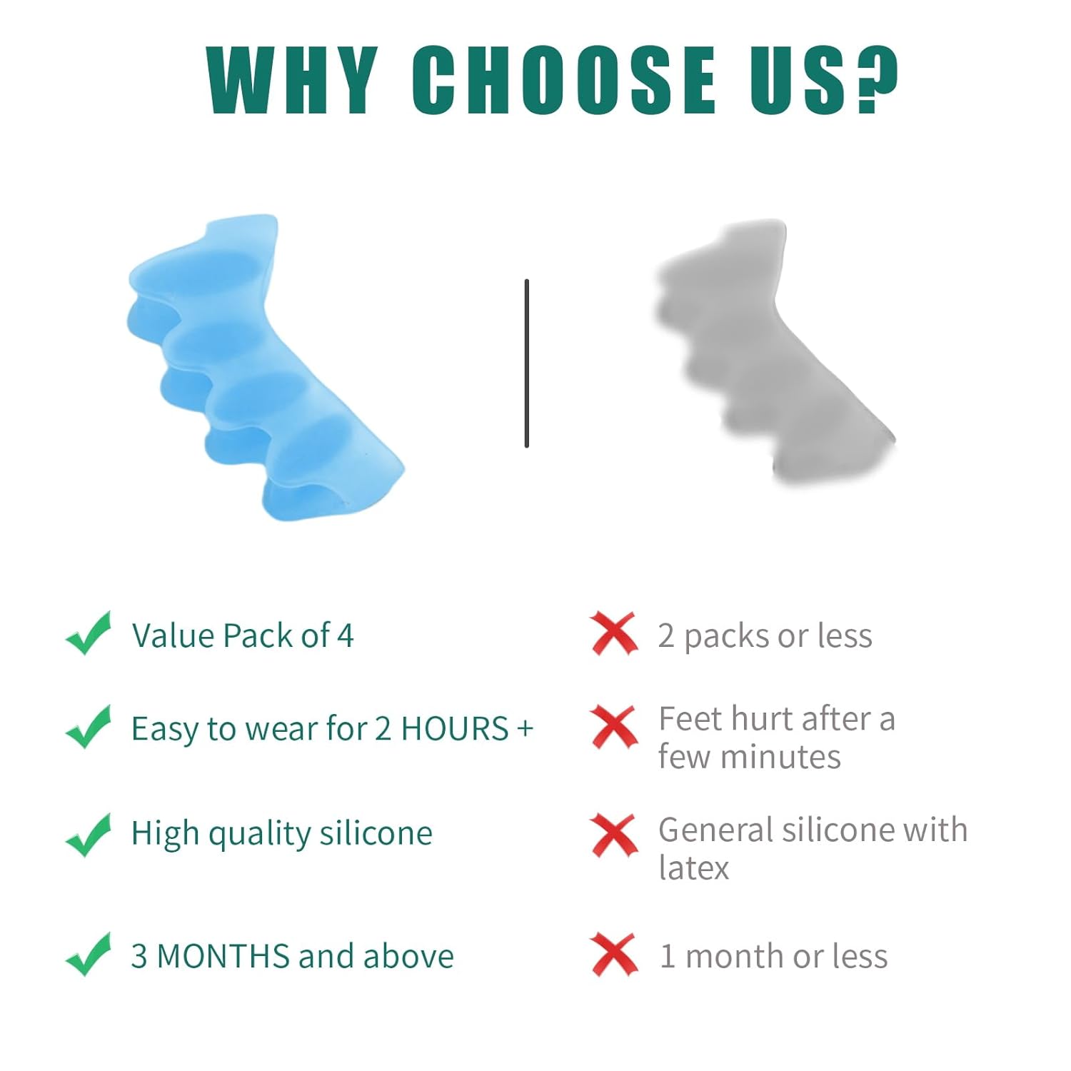 4 Pcs Silicone Toe Spacers – Yoga Toe Separators for Toe Straightening & Relaxation | Correct Overlapping Toes, Bunions, Hammer Toe | Toe Support toe separators for Women & Men (Blue, 3.98)