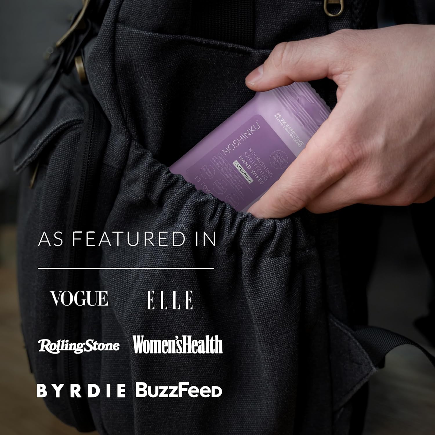 Noshinku Lavendula Hand Sanitizer Wipes, 6-Pack (90 Towelettes) – Resealable Travel Wipes with Ethyl Alcohol, Aloe & Green Tea, Plant-Based Fiber, Essential Oil Scents, Cruelty-Free & No Dyes