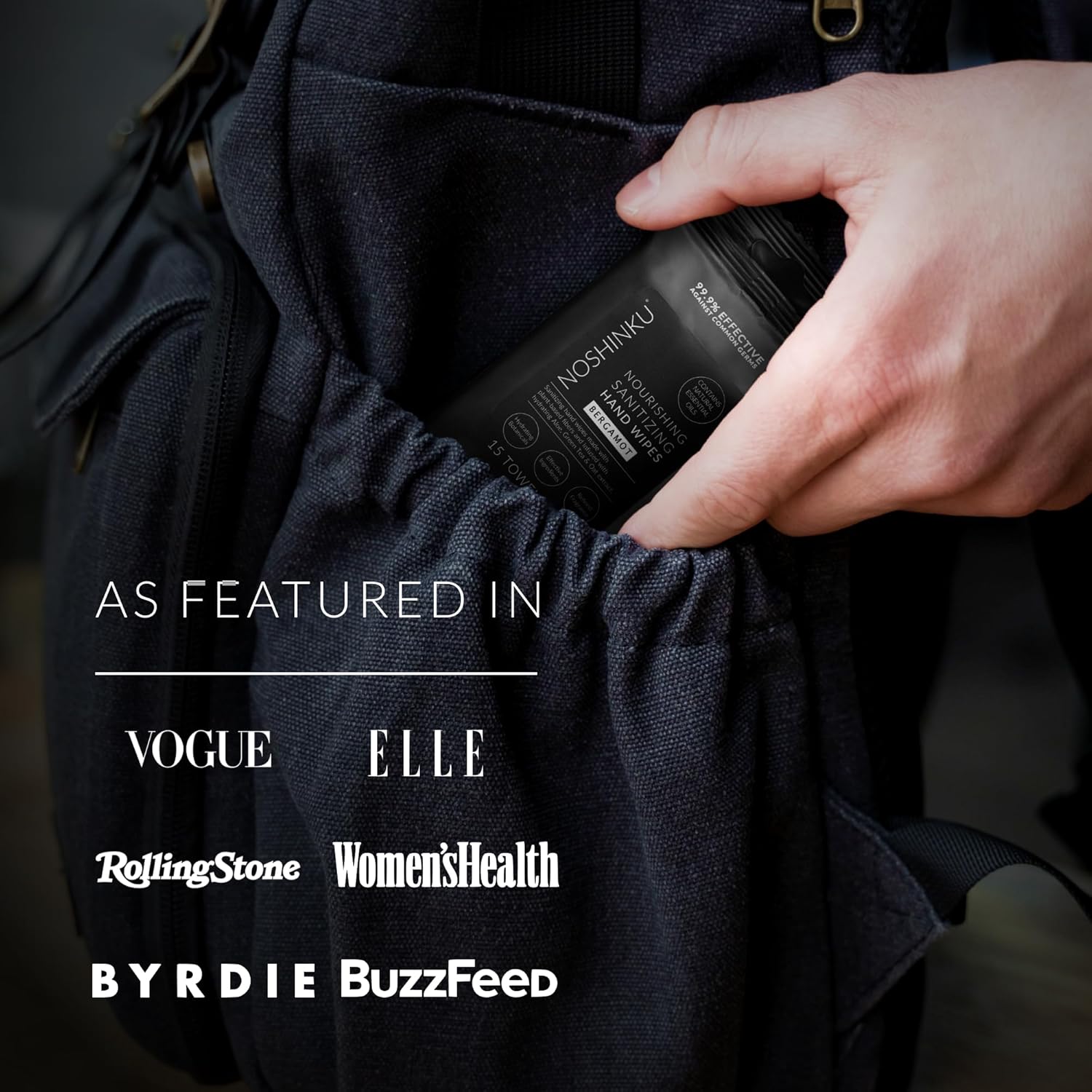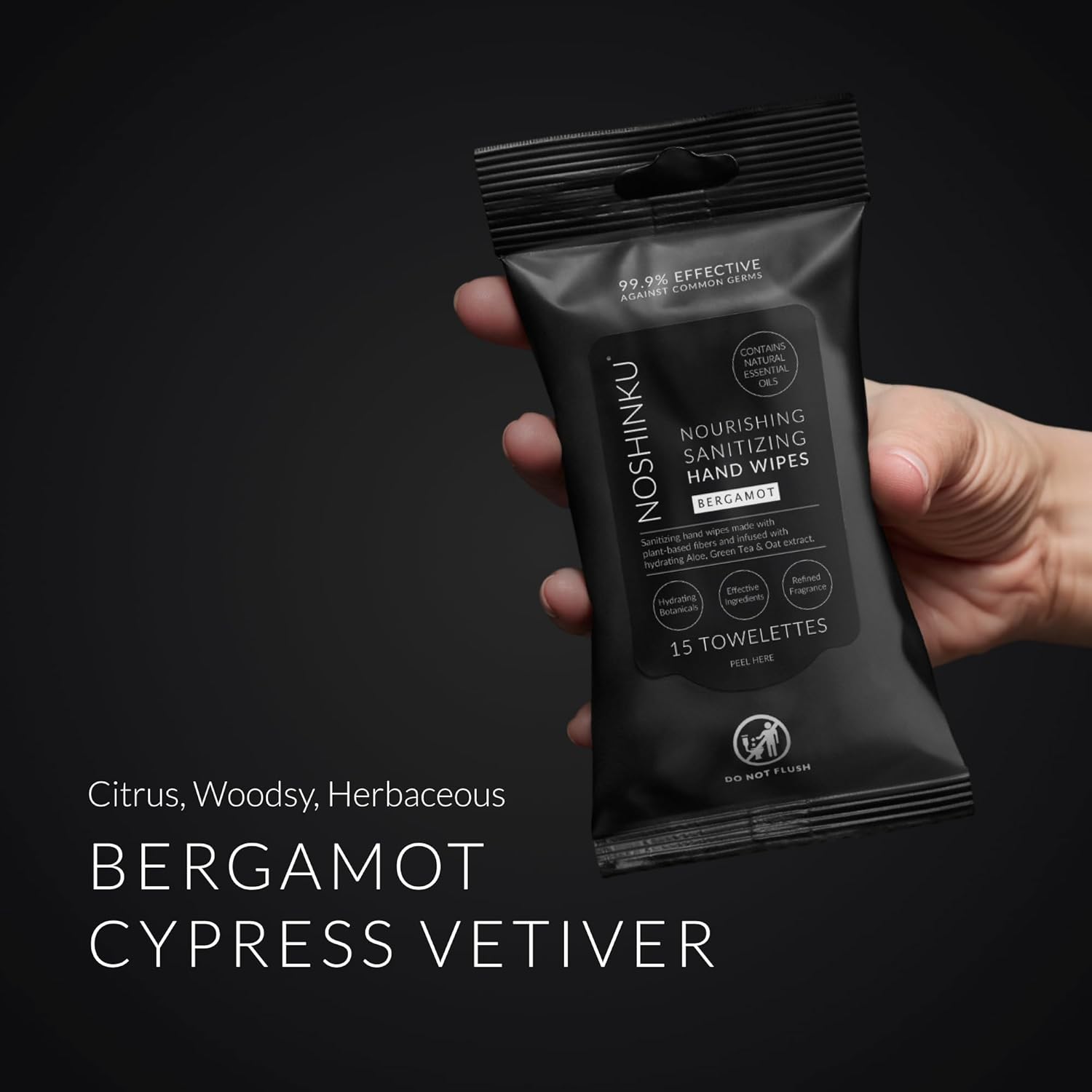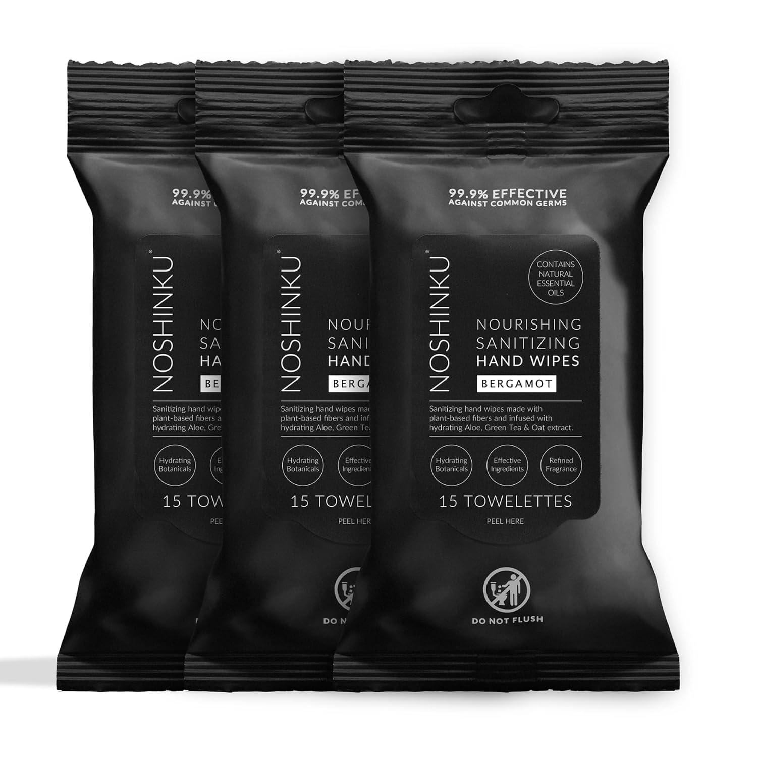 Noshinku – Bergamot Hand Sanitizer Wipes, 3-Pack (45 Towelettes) – Resealable Travel Wipes with Ethyl Alcohol, Aloe & Green Tea, Plant-Based Fiber, Essential Oil Scents, Cruelty-Free & No Dyes