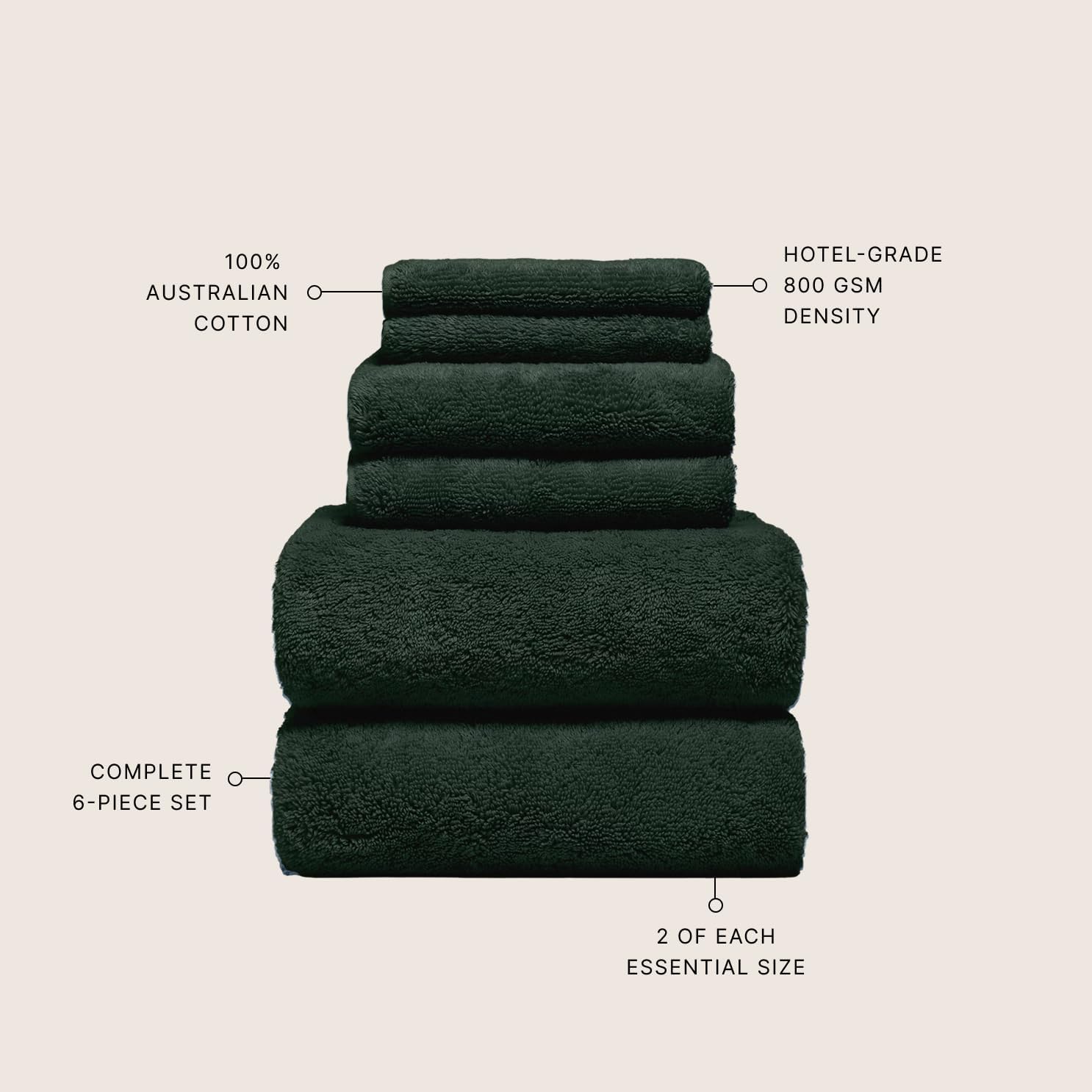 Italic Ultraplush 100% Australian Cotton Towels Standard 6 Piece Set, 2 Bath, 2 Hand, 2 Washcloths, 800GSM Lightweight, Highly Absorbent Quick Dry Soft Resort Grade Towels (Deep Forest)