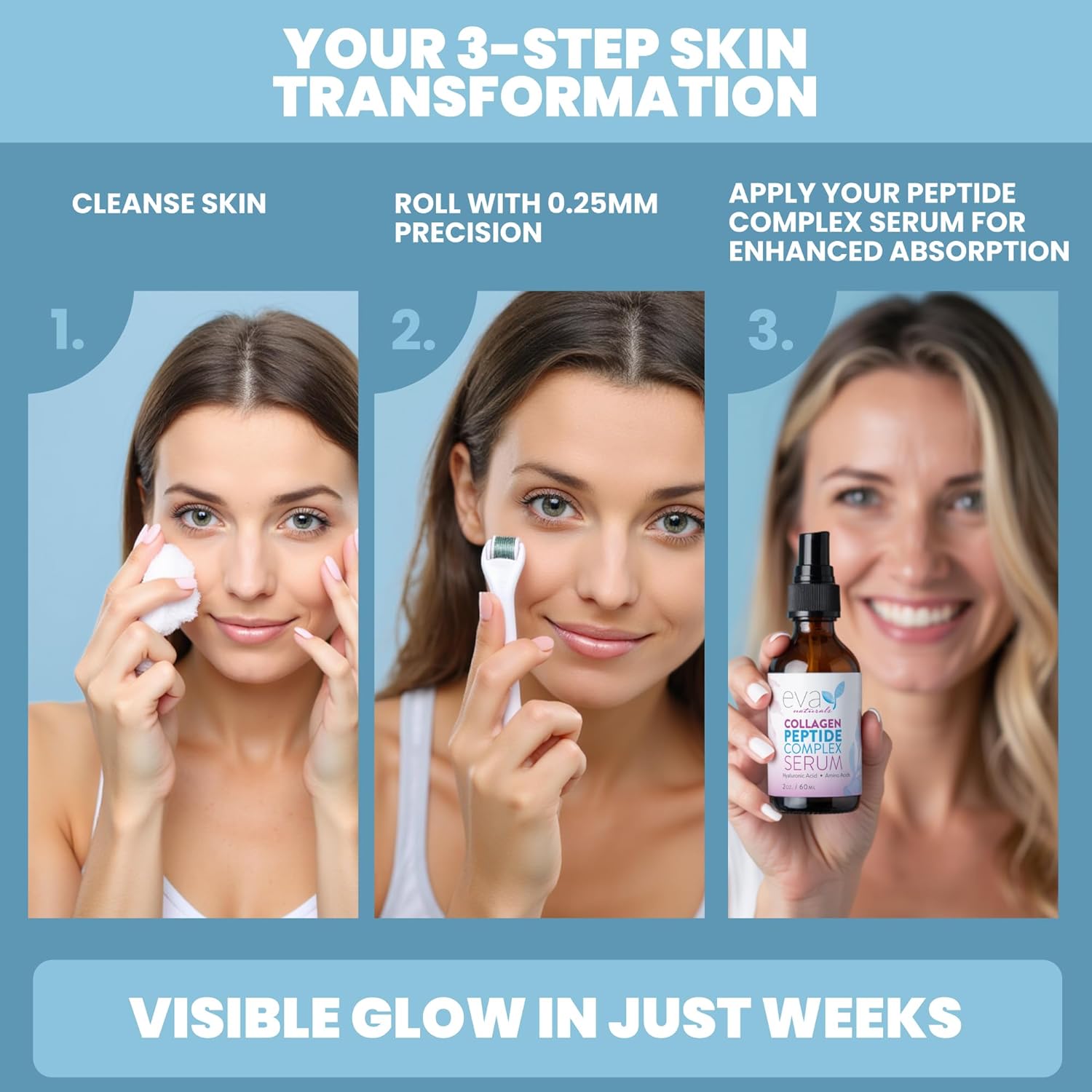 Eva Naturals Peptide Complex Serum + Microneedle Derma Roller - 0.25mm Titanium Derma Tool for Face & Scalp with Peptide Facial Serum & Derma Roller Bundle